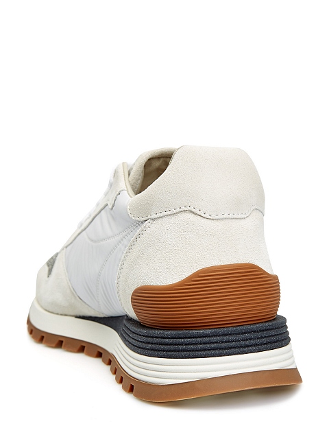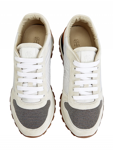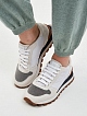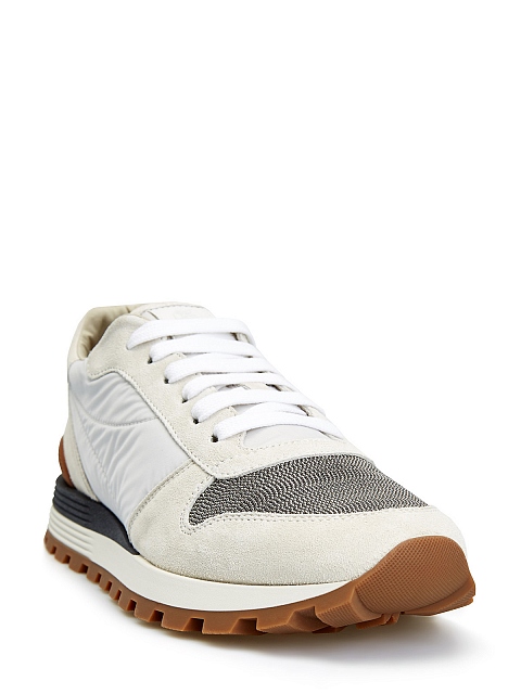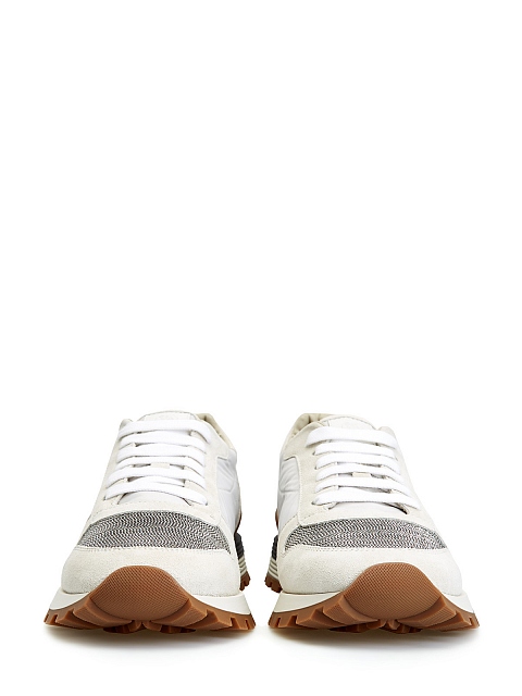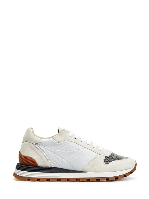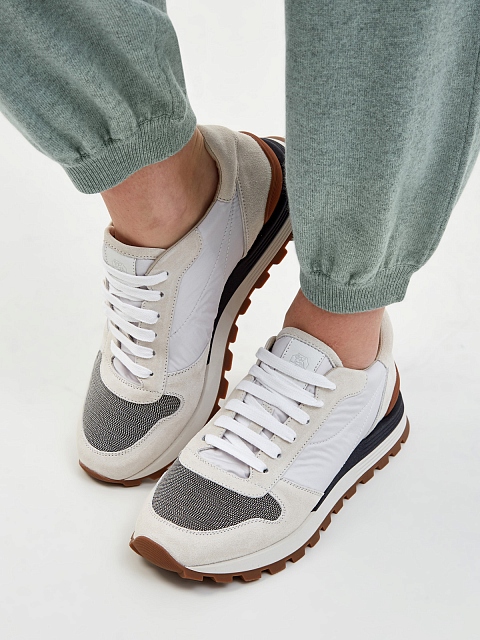 Элегантные женские кроссовки от Brunello Cucinelli созданы в светлой гамме. Мягкая замша сочетается с боковыми вставками из матовой технологичной ткани. Расслабленный, и в то же время изысканный стиль Модного дома подчеркивает вышивка мерцающими бусинами Мониль из сплава без содержания никеля. Рифленый протектор обеспечивает надежное сцепление с любыми поверхностями. Сделано в Италии.