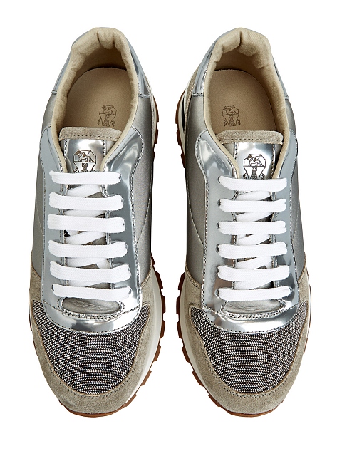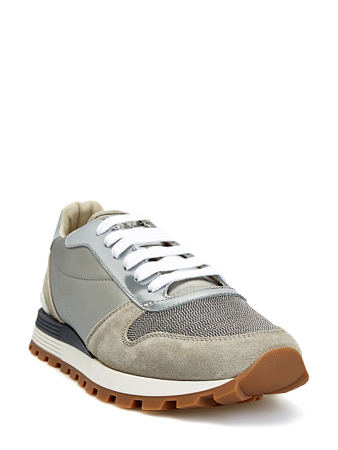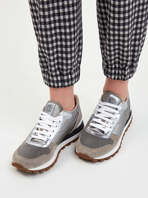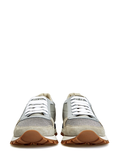Стильные женские кроссовки от Brunello Cucinelli созданы в песочных тонах. Мягкая замша сочетается с боковыми вставками из матовой технологичной ткани. Расслабленный, и в то же время элегантный стиль Модного дома подчеркивает вышивка мерцающими бусинами Мониль из сплава без содержания никеля. Рифленый протектор обеспечивает надежное сцепление с любыми поверхностями. Сделано в Италии.