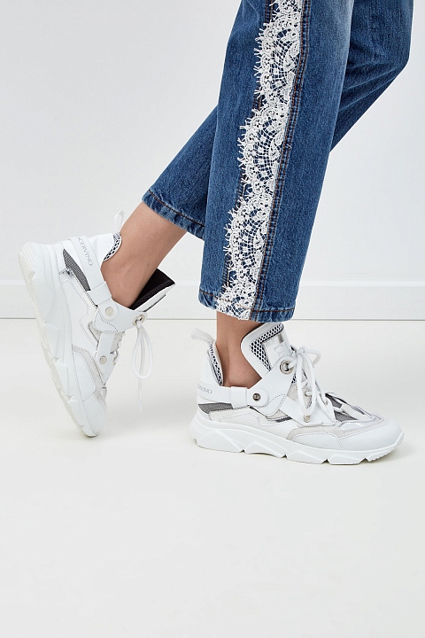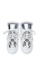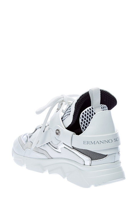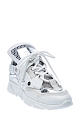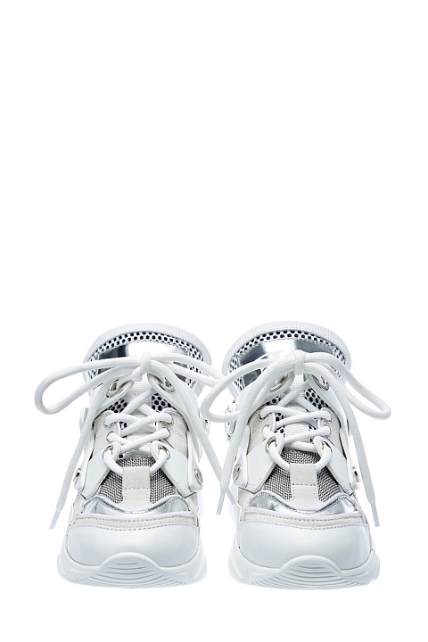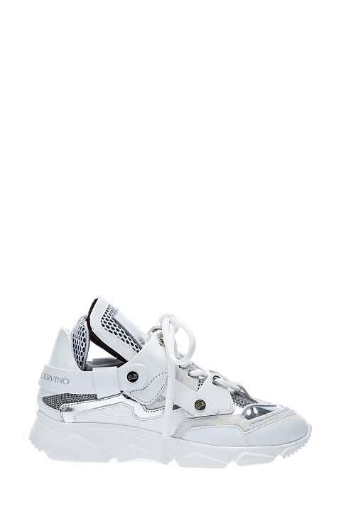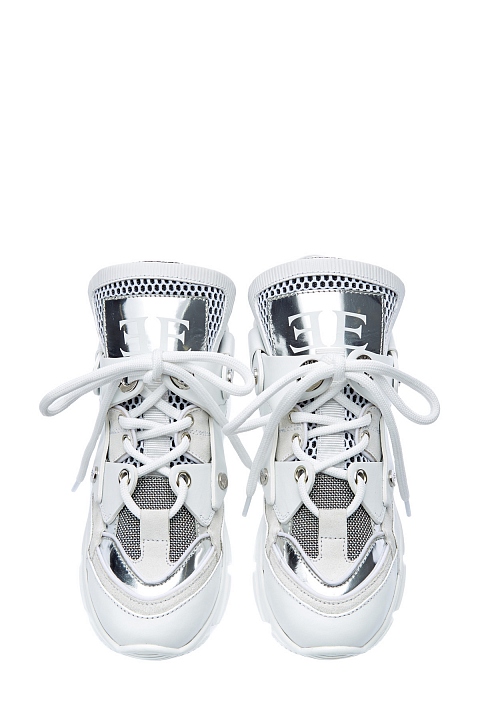 Стильные кроссовки из воловьей кожи от Ermanno Scervino. Модель oversize с высоким язычком и оригинальной граненой подошвой. Лаковая серебристая отделка сочетается с матовыми вставками из мембраны, динамику образу придают объемные элементы кроя. Детали: рельефный протектор, сверхлегкая подошва, внутренняя отделка из натуральной кожи. Сделано в Италии.