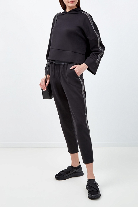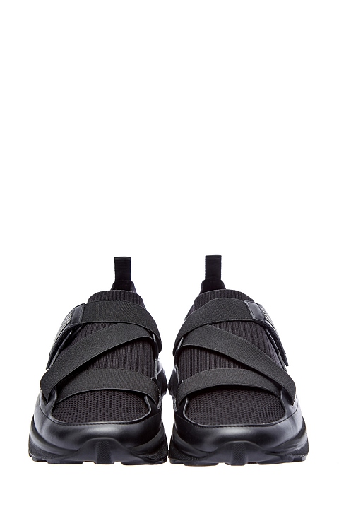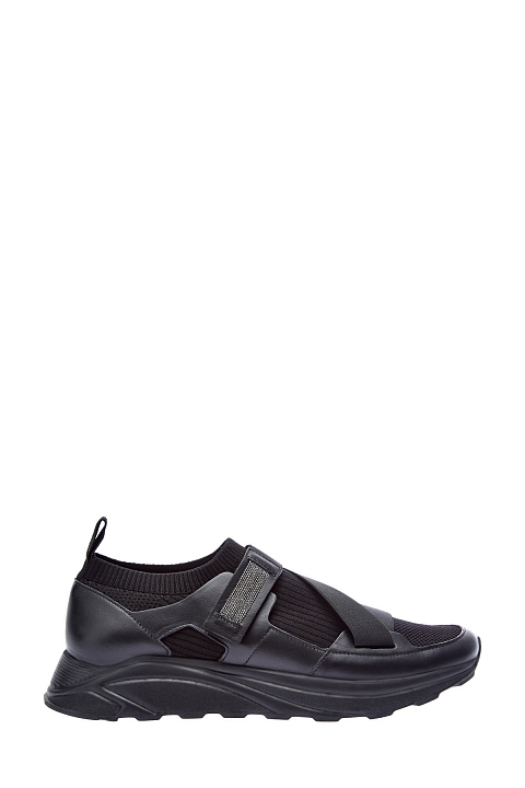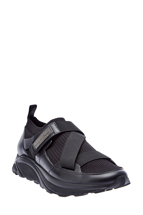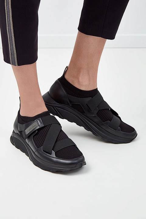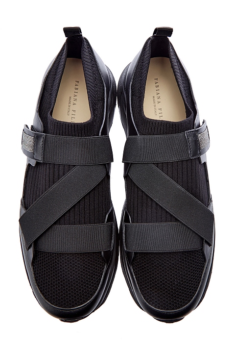 Кроссовки от Fabiana Filippi созданы из технического трикотажа — эластичный и дышащий материал вносит в образ фактурные акценты. Фигурная отделка из натуральной кожи придает динамику. Эластичные фиксирующие ленты с застежкой велькро заменяют шнуровку и расшиты сверкающими бусинами. Амортизирующая подошва 3.5 см и внутренняя отделка из кожи обеспечивают комфорт. Длина стельки в размере 39 составляет 25 см. Сделано в Италии.