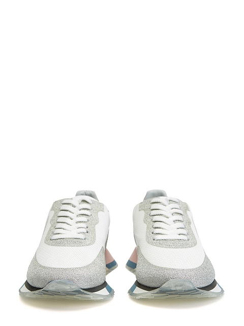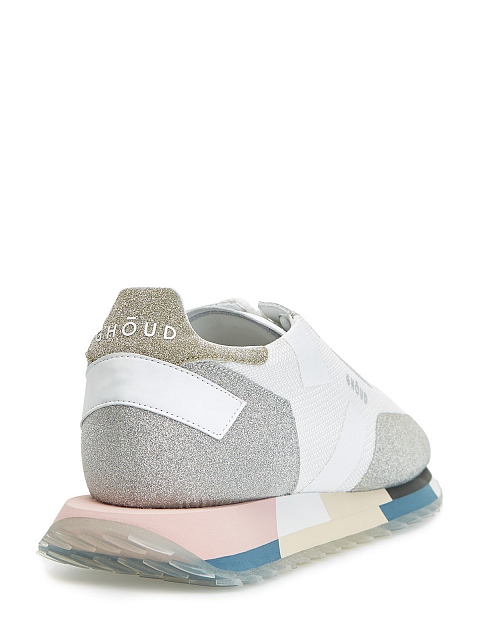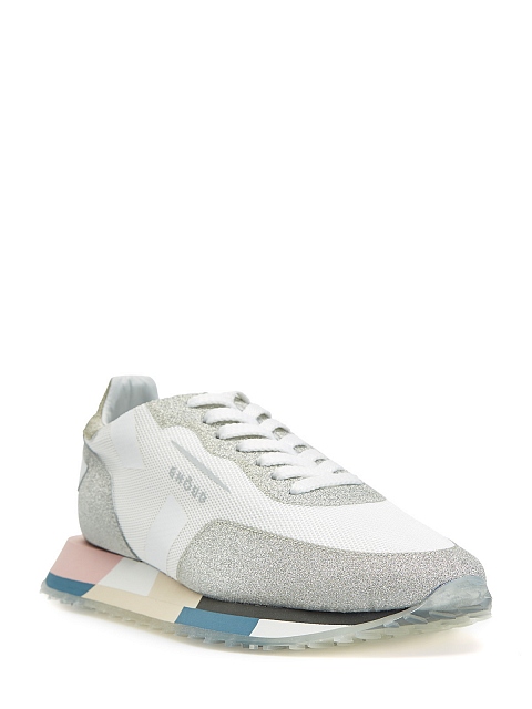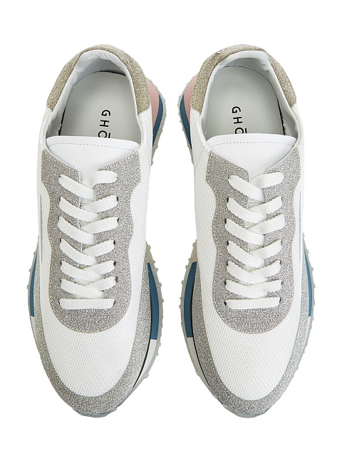Комбинированные женские кроссовки Star Low от Ghoud. Эффектная модель сочетает сетчатый мембранный текстиль и гладкую кожу. Мерцающие вставки с серебристым и золотистым напылением и рант в стиле colorblock придают обуви оригинальный штрих. Детали: амортизирующая подошва, логотип бренда. Сделано в Италии.