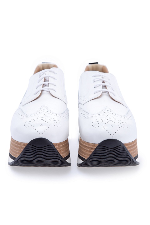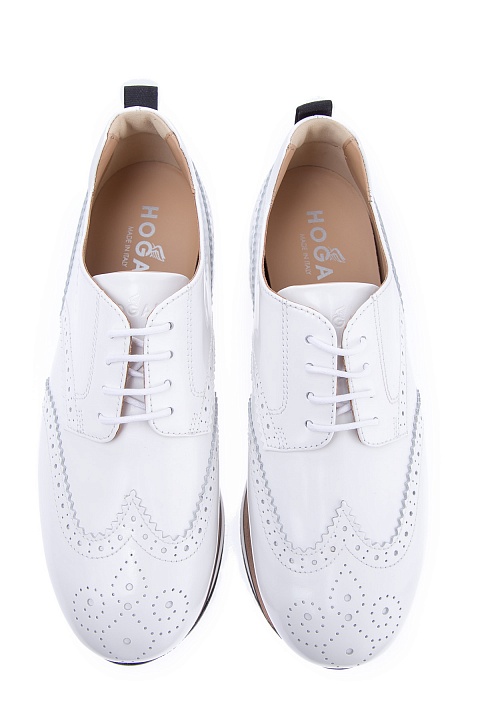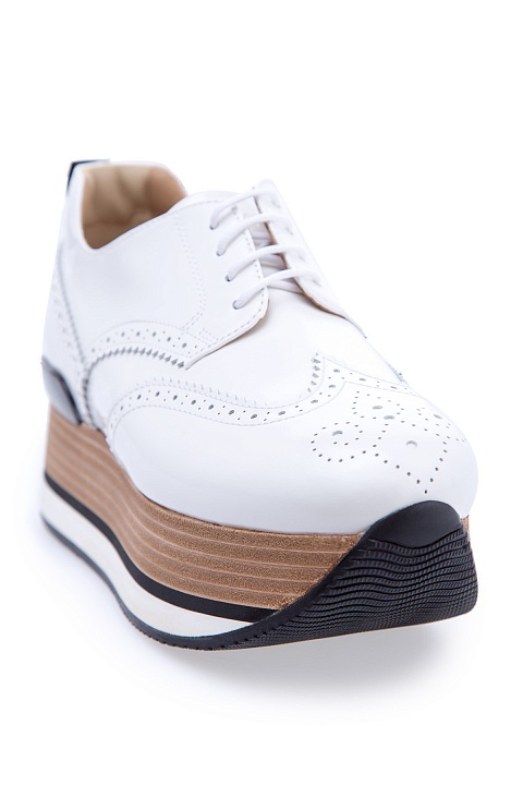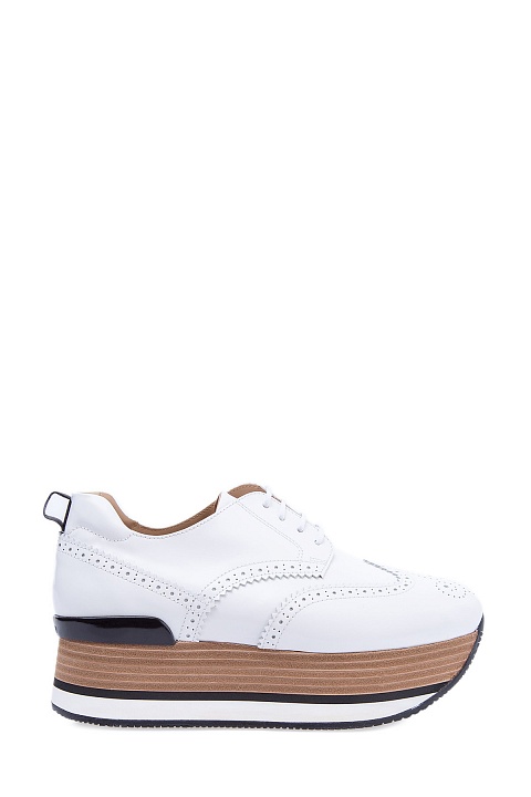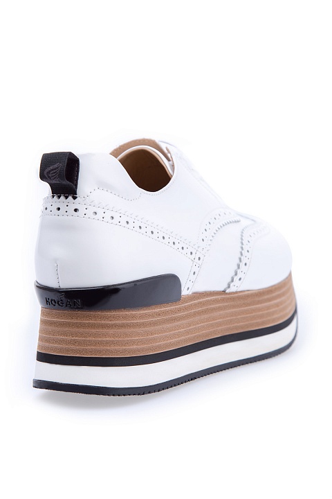 Яркие кроссовки Hogan изготовлены из полированной гладкой кожи с текстильными перфорированными вставками белоснежного цвета. Отличительной особенностью модели стала Maxi Platform из вспененного каучука толщиной 5,5 см. Задник дополнен силиконовой вставкой с названием бренда.