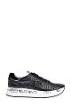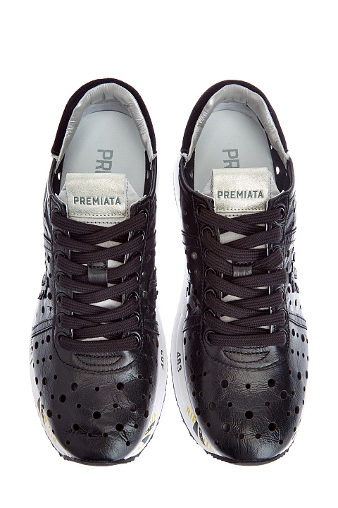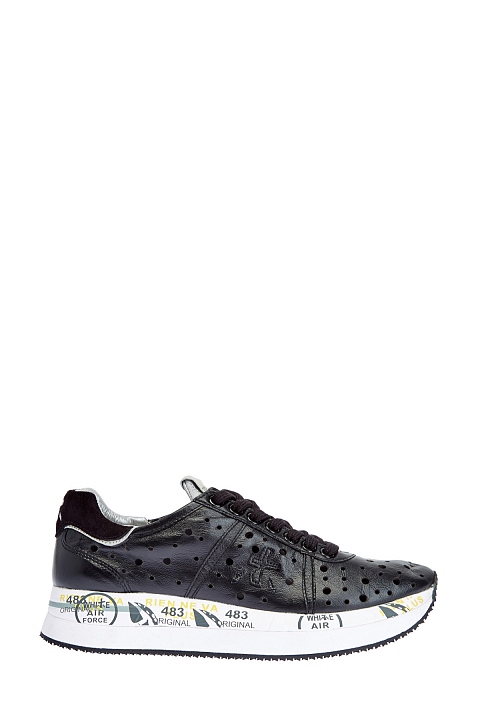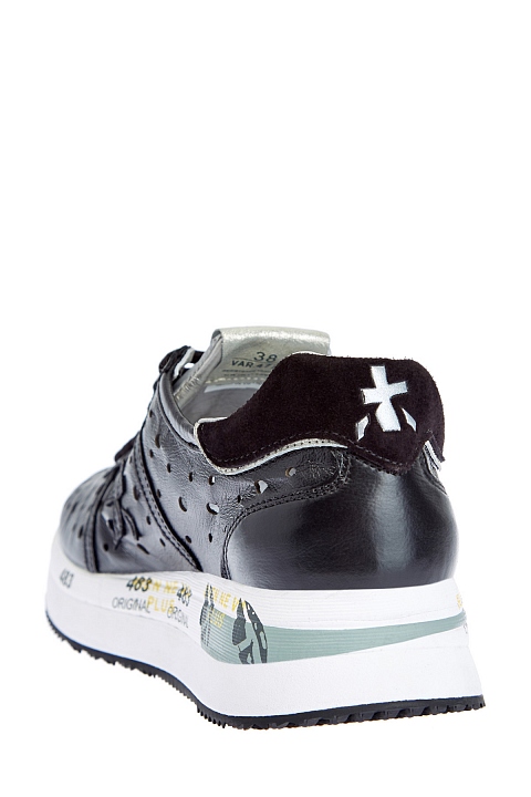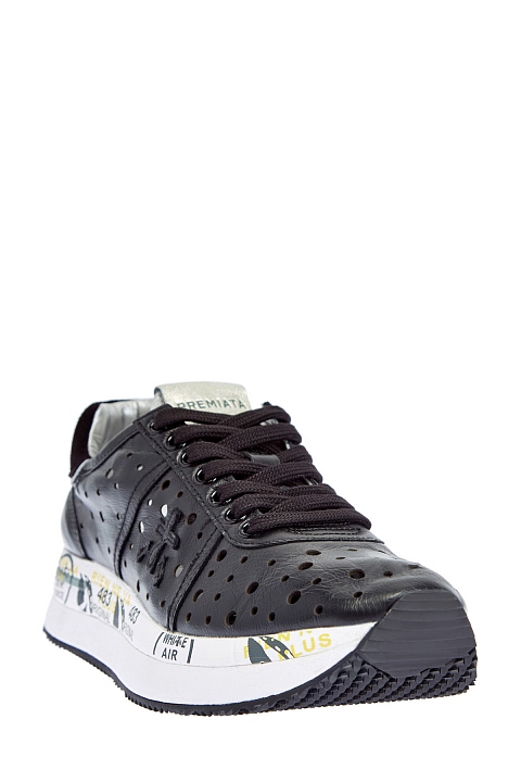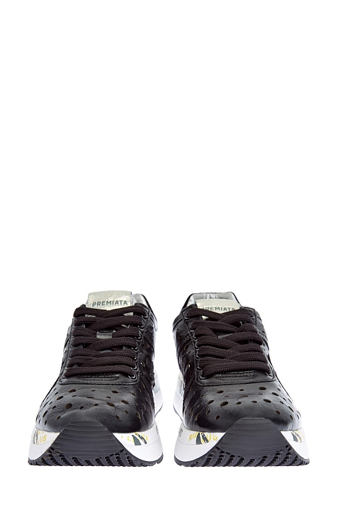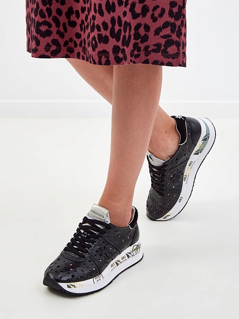 Кроссовки Conny от Premiata созданы из матовой кожи кенгуру в черном цвете. Элегантный перфорированный принт в сочетании с динамичными линиями позволяет интегрировать модель в любой повседневный образ. Массивная двухслойная подошва дополнена культовым принтом на ранте. Детали: контрастные вставки из металлизированной кожи и замши, тисненый логотип бренда, шнуровка в тон, рифленый протектор.