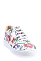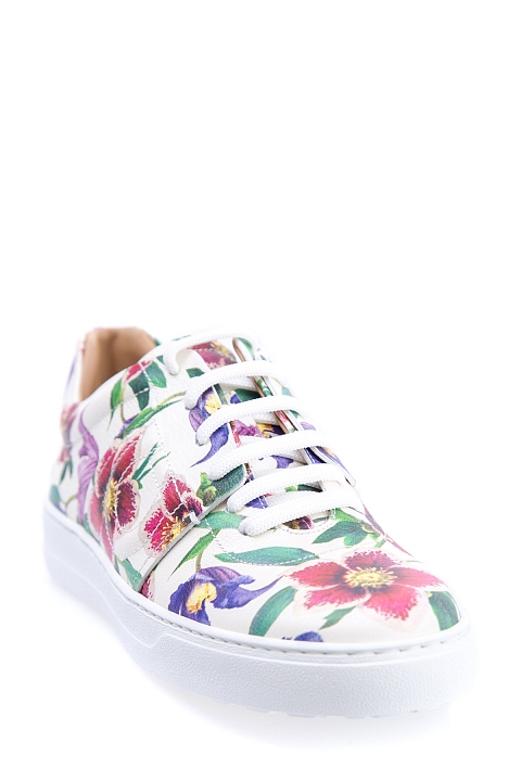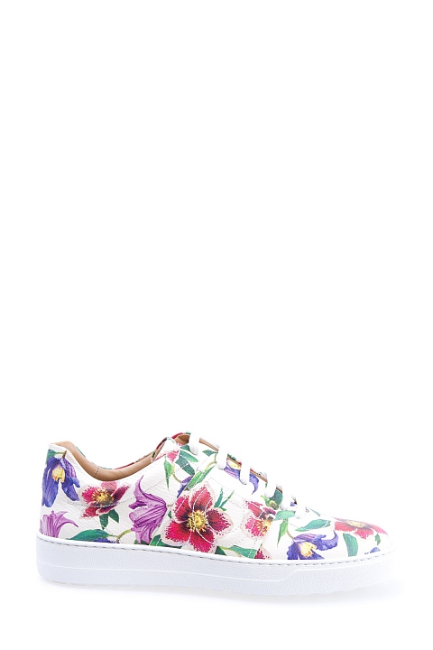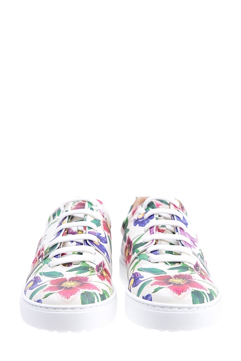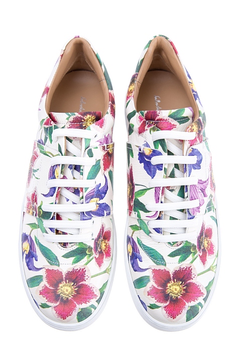 Яркие женские кроссовки Salvatore Ferragamo из мягкой кожи белого цвета с цветочным принтом в ретро-стиле и вышитым символом бренда Gancini на боковых панелях. Модель закрыта плотной однотонной резиновой подошвой и фиксируется при помощи функциональной шнуровки. Сделано в Италии.