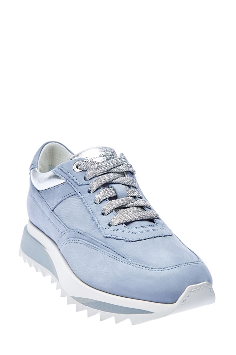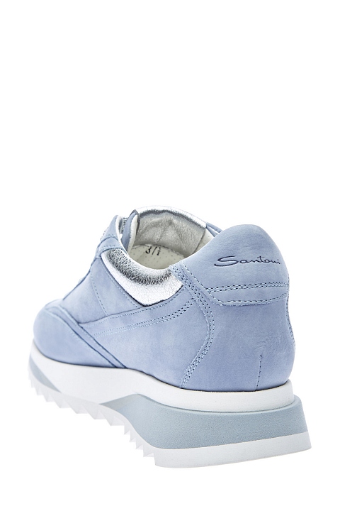 Лаконичные кроссовки от Santoni выполнены из отполированной вручную замши. Модель-carryover бренда дополнит как повседневный, так и спортивный образ за счет актуальной массивной подошвы. Пастельный голубой оттенок подчеркнут металлизированными акцентами цвета серебра: шнуровкой с нитью люрекса и вставками из полированной кожи. Детали: кожаная стелька, мягкая набивка манжет для комфортной посадки. Сделано в Италии.