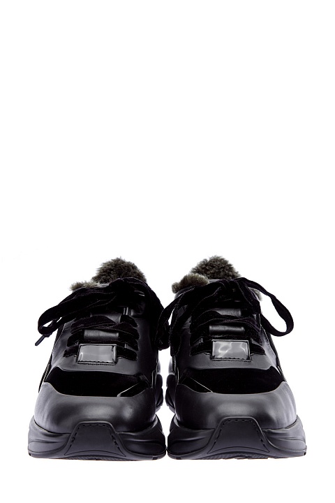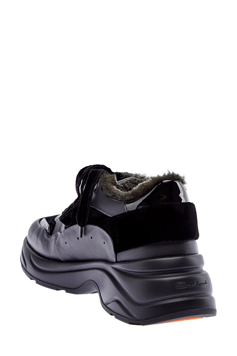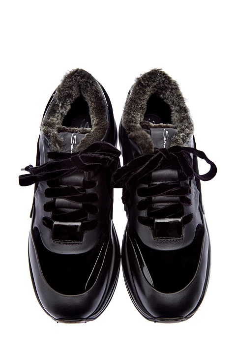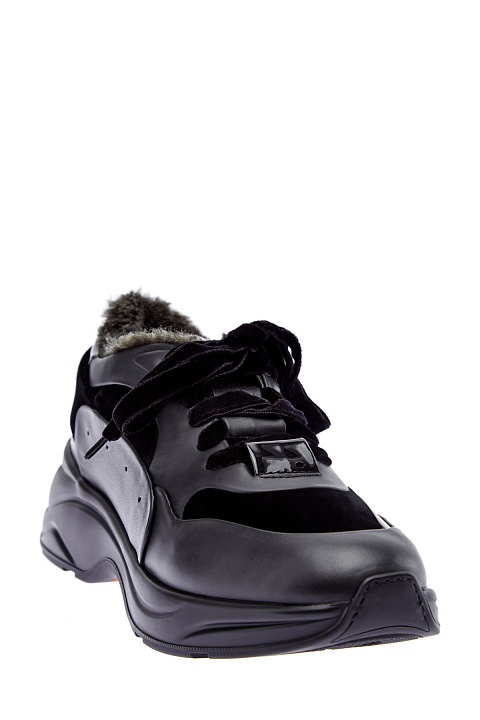 Эффектные женские кроссовки от Santoni выполнены из матовой кожи черного цвета. Модель дополнена отделкой из велюра с богатой ворсистой текстурой. Динамичный образ создает высокая рельефная подошва, а подкладка из овчины дополнительно утепляет обувь. Детали: бархатная шнуровка и мягкие манжеты для максимального комфорта. Длина по стельке в размере 38.5 — 25 см. Сделано в Италии.