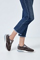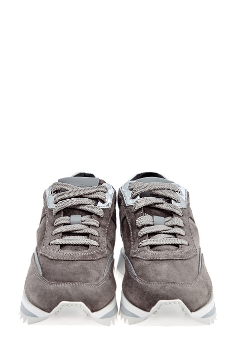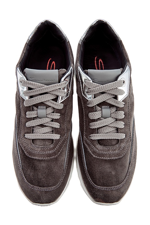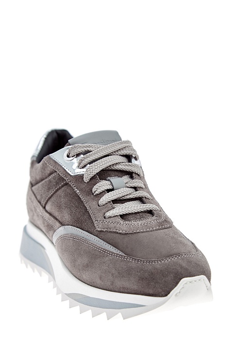 Эффектные женские кроссовки от Santoni сочетают элементы из бархатистой замши и матовые вставки из кожи. Универсальная серо-коричневая цветовая гамма дополнена яркими акцентами в виде металлизированных деталей с зеркально-глянцевой поверхностью. Рифленый протектор придает изделию динамичный и стильный внешний вид. Детали: закругленный мысок, легкая подошва 3.5 см из профилированной резины и каучука. Сделано в Италии.