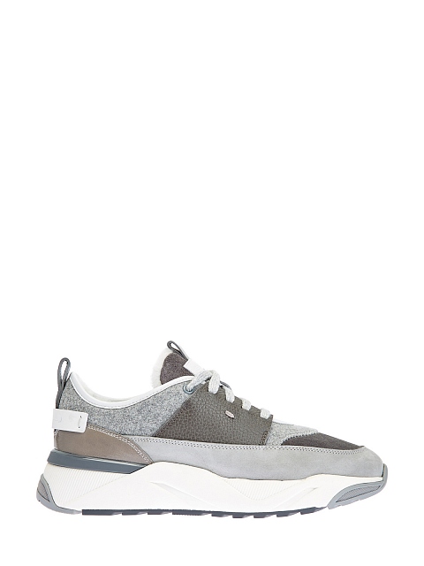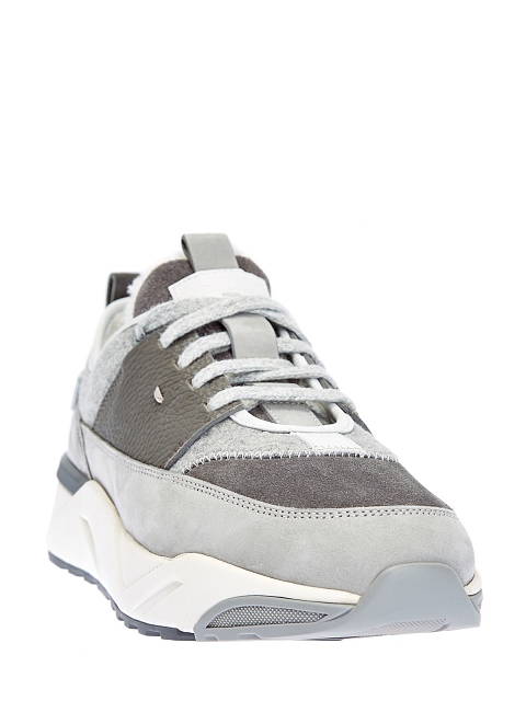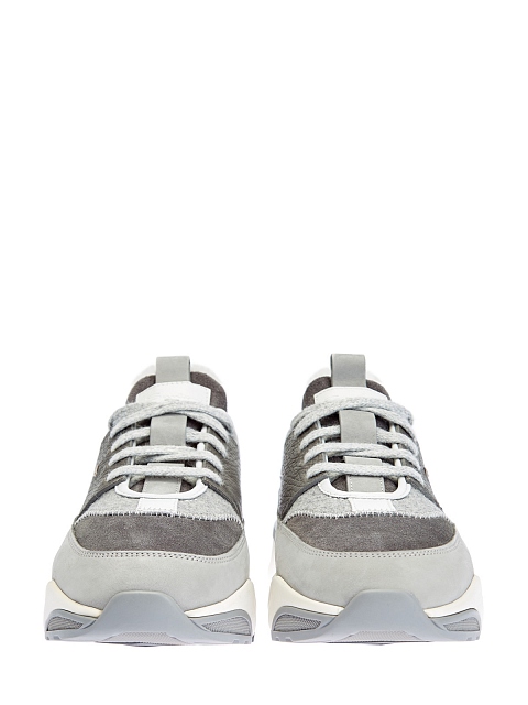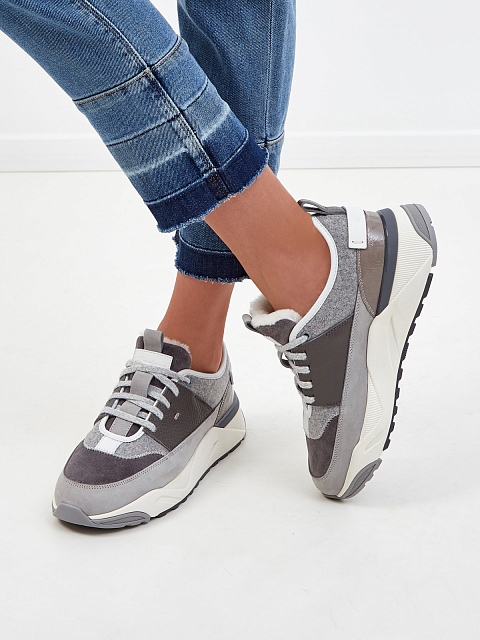 Оригинальные кроссовки от Santoni выполнены из крупнозернистой кожи и бархатистой замши в серой гамме. Вставки из фактурного шерстяного твида делают модель идеальной для осенне-зимнего сезона. Образ в стиле спортшик создает сочетание глянцевых акцентов и массивной рифленой подошвы с противоскользящим протектором. Внутренняя отделка из натурального меха обеспечивает максимальный комфорт в течение дня. Сделано в Италии.