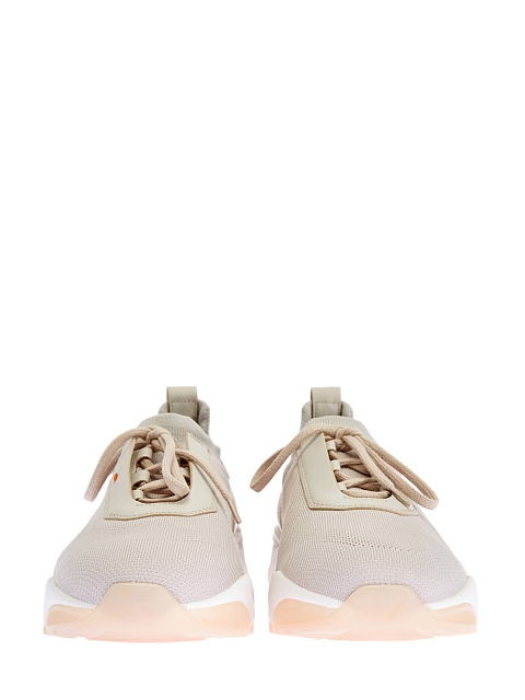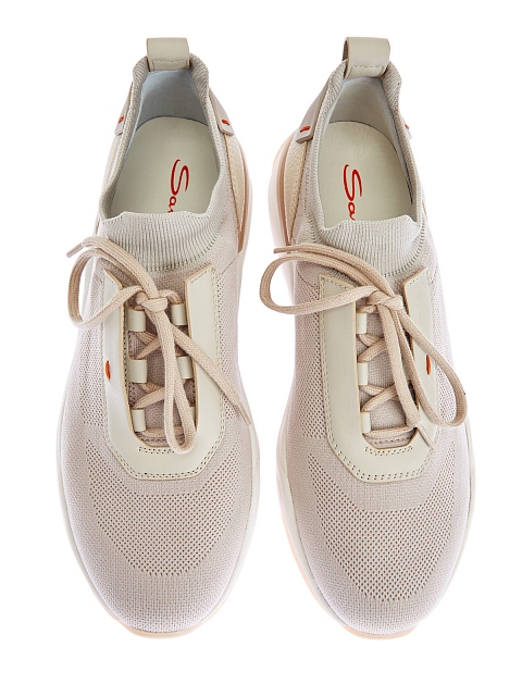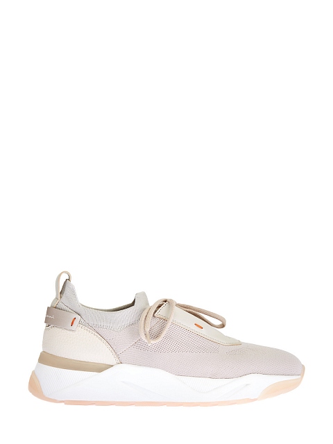 Элегантные женские кроссовки в от Santoni созданы в песочных тонах из эластичного трикотажа. Расслабленный стиль Модного дома подчеркивают вставки из крупнозернистой и гладкой кожи, легкая амортизирующая подошва EVA обеспечивает максимальный комфорт в движении. Детали: рифленый протектор, яркая фирменная прострочка. Сделано в Италии.