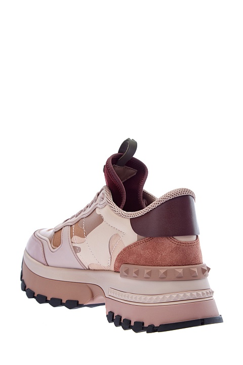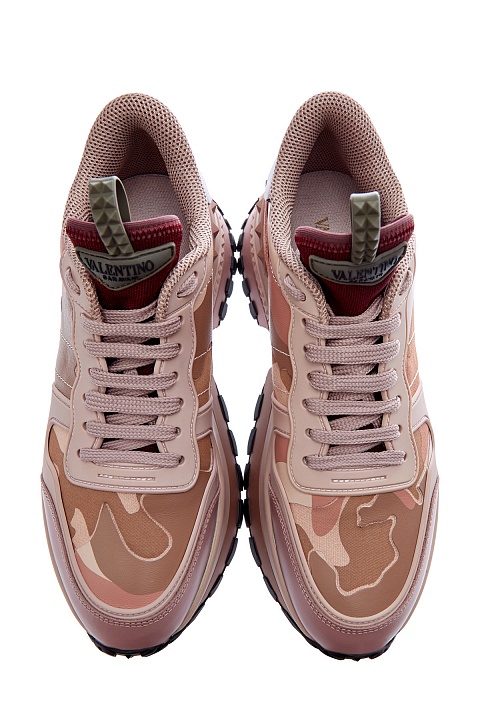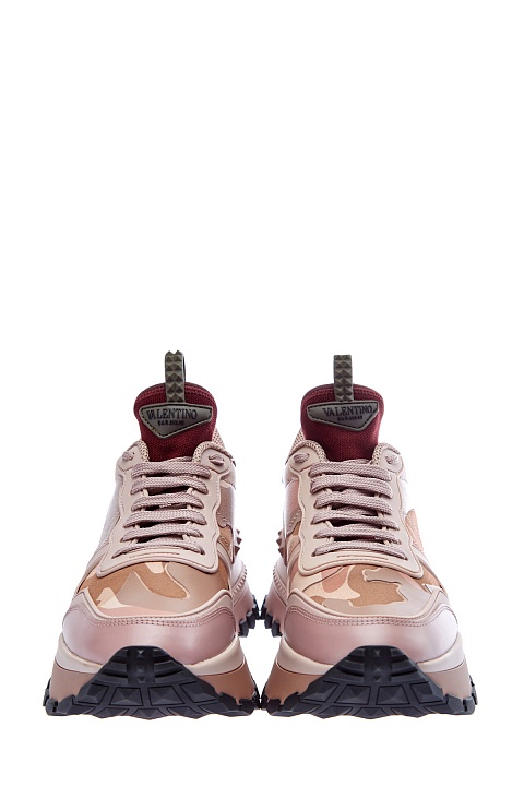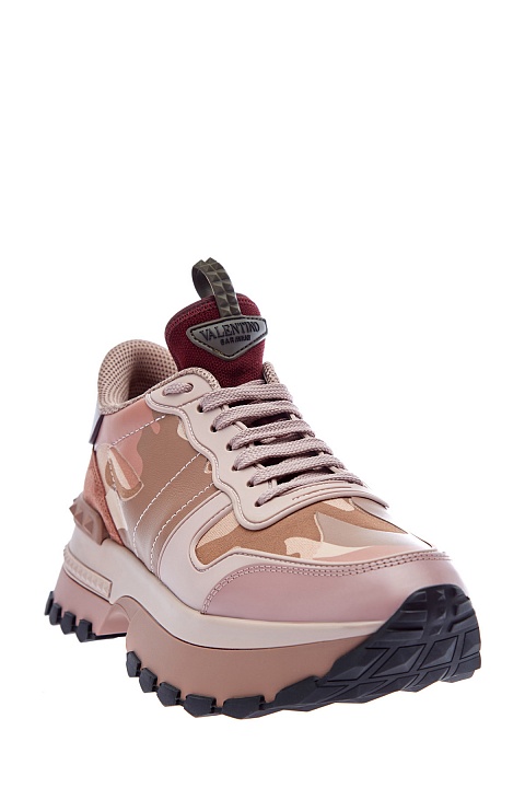Кроссовки Rockrunner.Up от Valentino Garavani сочетают кожу, замшу и прочный текстиль. Фирменный камуфляжный мотив создан в бежево-розовой гамме, линии рисунка подчеркнуты нанесенным поверх принтом с эффектом кожаной поверхности. Модель на массивной подошве с противоскользящим протектором и фирменными накладками из силикона с тиснением фирменных заклепок. Длина стельки для размера 39 составляет 25 см. Сделано в Италии.