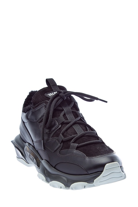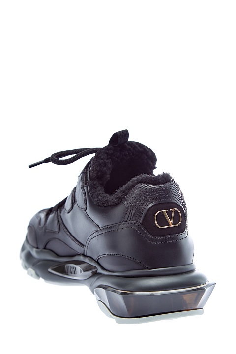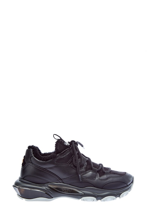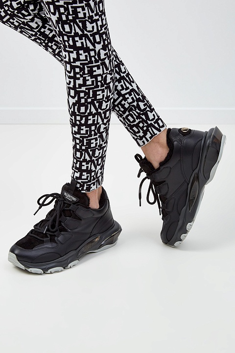Яркие кроссовки Bounce от Valentino Garavani созданы в монохромном черном цвете. Рельефные вставки из прозрачного полимера придают образу динамику и за счет амортизации обеспечивают комфорт в течение дня. Внутренняя отделка из овчины делает модель особенно актуальной для составления зимних образов. Длина стельки для размера 39 составляет 24.5 см. Сделано в Италии.