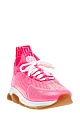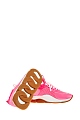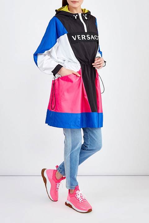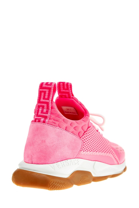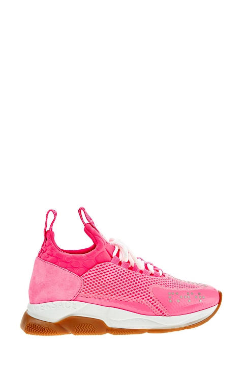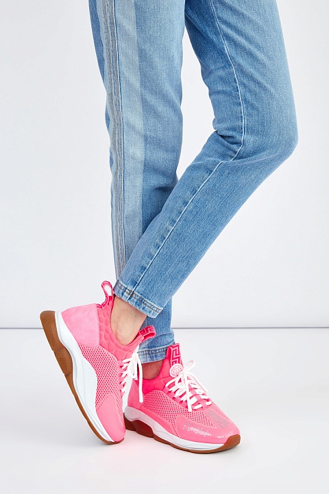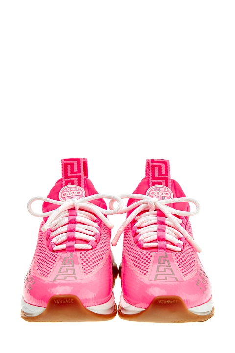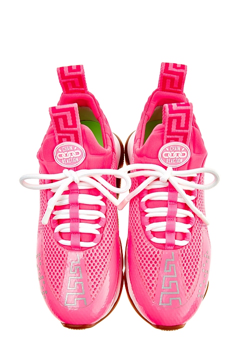 Неоново-розовые кроссовки Cross Chainer из линии Chain Reaction от Versace выполнены из дышащей мембранной ткани. Модель на культовой массивной подошве с узором протектора в виде цепи дополнена манжетами из неопрена с тиснением под кожу аллигатора. Светоотражающие элементы созданы в виде фирменного меандрового узора и надписей «Power» и «Versace», выполненных шрифтом Брайля. Вставки из замши в тон завершают дизайн. Сделано в Италии.