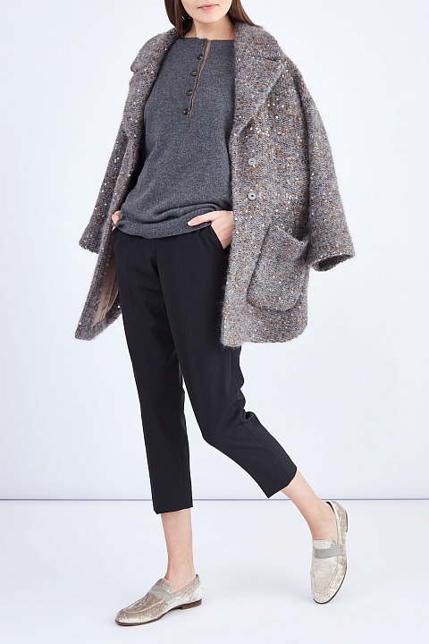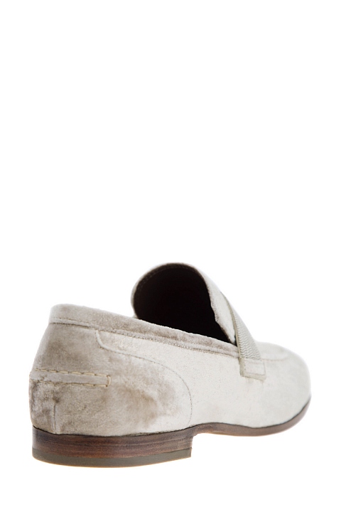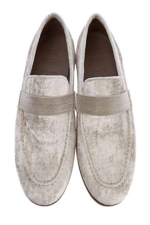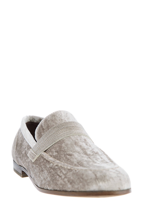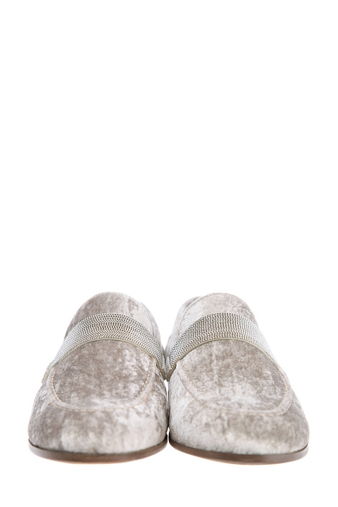 Эффектные женские лоферы из осенне-зимней коллекции Brunello Cucinelli созданы из кожи и мягкого бархата цвета серого жемчуга с сияющим металлизированным эффектом ламе. Фирменный стиль бренда подчеркнут отделкой из утонченных цепочек мониль на ремешке удлиненной союзки.