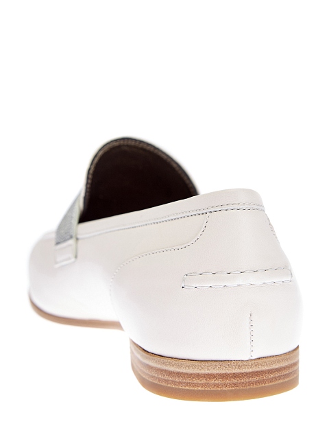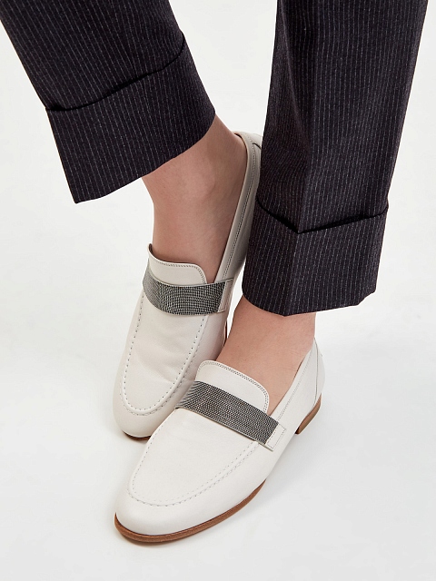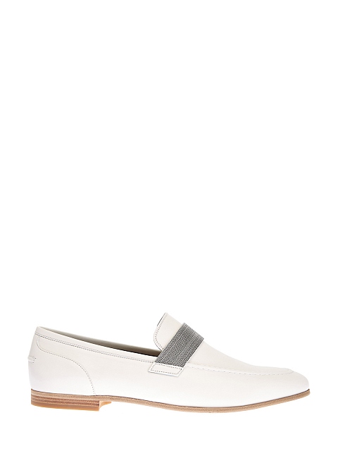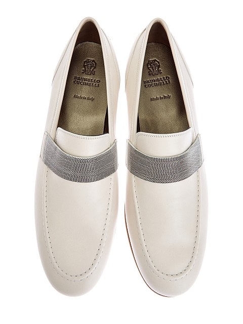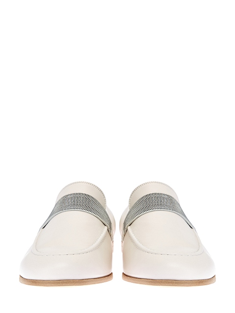 Элегантные женские лоферы от Brunello Cucinelli выполнены в молочно-белом оттенке. Модель из гладкой матовой кожи станет идеальным дополнением повседневных образов. Изысканный штрих — выполненная вручную отделка из ювелирных бусин Мониль, подчеркивающая фирменный стиль Модного Дома. Детали: миндалевидный мысок, фактурная прострочка. Сделано в Италии.