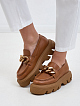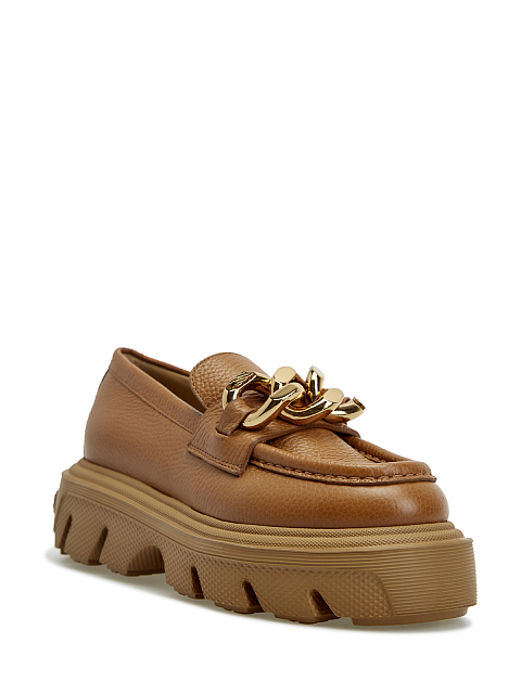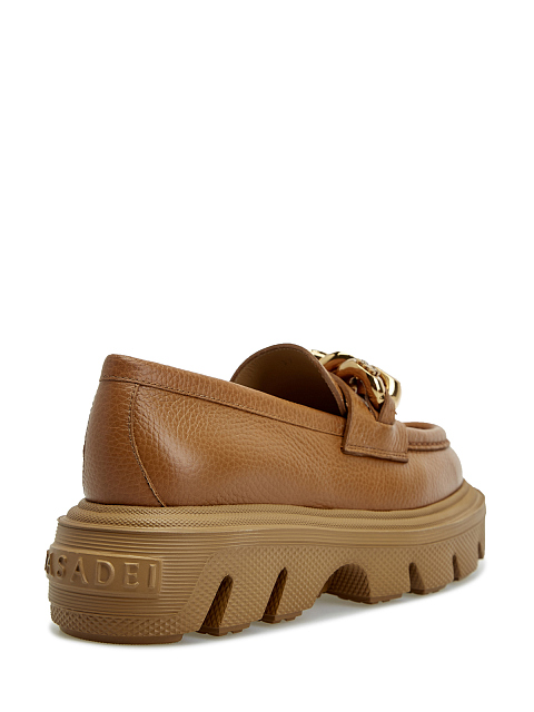 Женские лоферы от Casadei выполнены из из крупнозернистой кожи в ореховом оттенке. Модель в мужском стиле на массивной платформе станет эффектным дополнением повседневных образов. Неформальный штрих — крупная литая цепь C-chain на передней планке. Детали: противоскользящий протектор, фактурный рант.