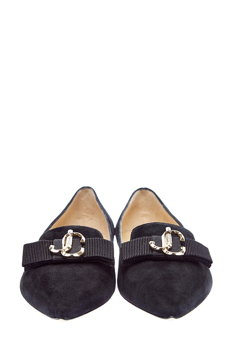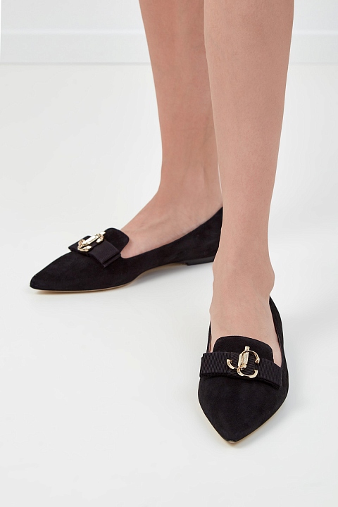 Лаконичные лоферы Gala от Jimmy Choo выполнены из бархатистой замши. Элегантный акцент в образ вносят банты из репсовой ленты и 3D-логотип бренда с золотистым напылением. Модель с заостренным мыском и небольшим каблуком. Детали: внутренняя отделка из кожи, подошва из кожи. Длина по стельке в размере 38.5 - 24.5 см. Сделано в Италии.