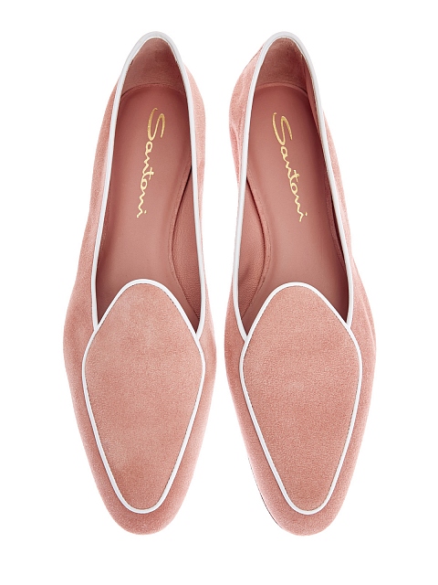 Элегантные женские лоферы от Santoni выполнены из бархатистой замши в приглушенном оттенке чайной розы. Однотонное исполнение и минималистичный дизайн делает модель идеальным дополнением повседневных образов. Обувь с лаконичным контрастным кантом на верхней панели дополнена зауженным мыском и тонкой подошвой. Сделано в Италии.