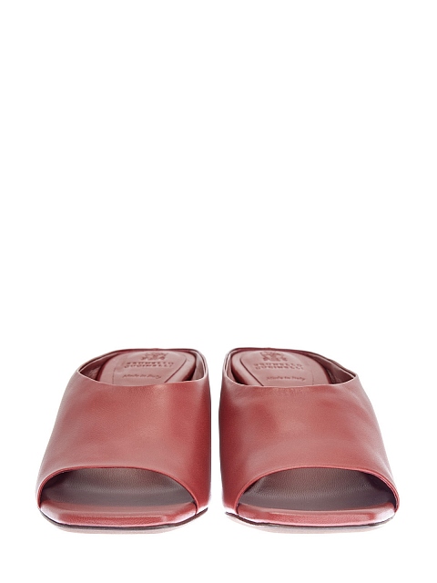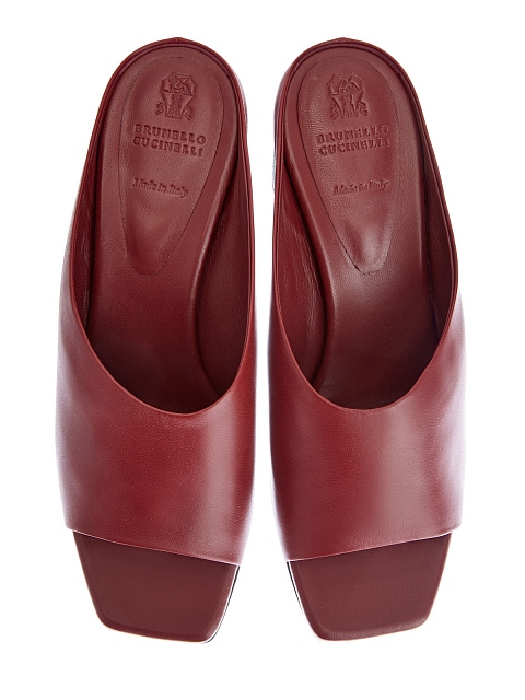 Элегантные женские мюли от Brunello Cucinelli созданы из телячьей кожи в винном оттенке. Устойчивый наборный каблук декорирован рядами цепочек Мониль без содержания никеля — мерцающая отделка подчеркивает присущий Модному Дому изысканный стиль. Открытая модель со скошенным мыском станет идеальным дополнением женственных летних образов. Сделано в Италии.