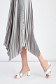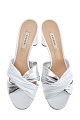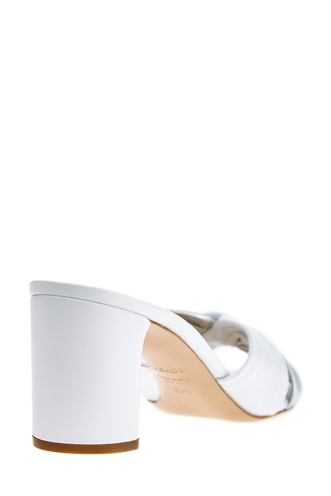 Эффектные сабо от Casadei выполнены из натуральной матовой кожи. Верхняя панель с перекрестной отделкой сочетает драпированные ленты белого и металлизированного серого цветов. Детали: устойчивый каблук овальной формы высотой 7 см, внутренняя поверхность из кожи. Сделано в Италии.