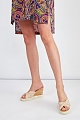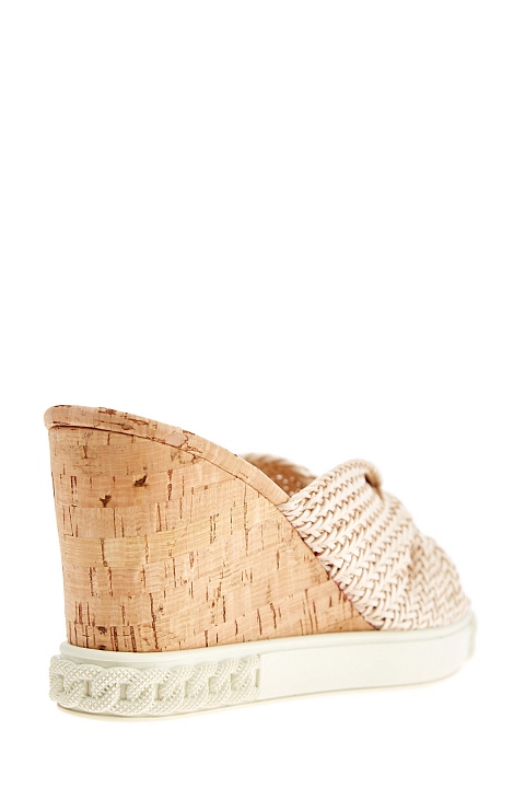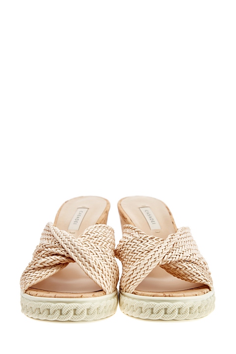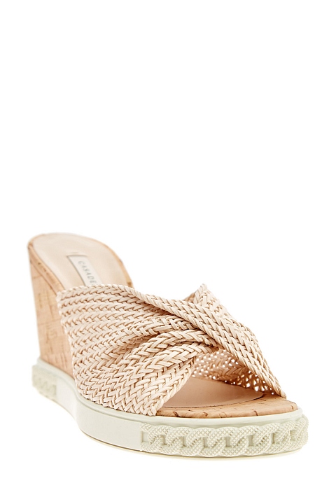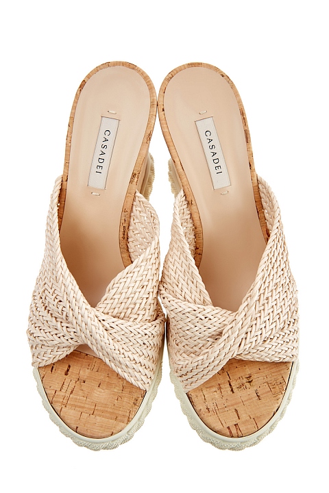 Эффектные сабо от Casadei выполнены из натурального пробкового материала с фактурной поверхностью. Верхняя панель с перекрученной отделкой сплетена из тонкой тесьмы телесного оттенка. Фирменный стиль подчеркивает прорезиненная отделка ранта с объемным узором в виде звеньев цепи. Детали: внутренняя отделка из кожи, высота платформы 10 см. Сделано в Италии.