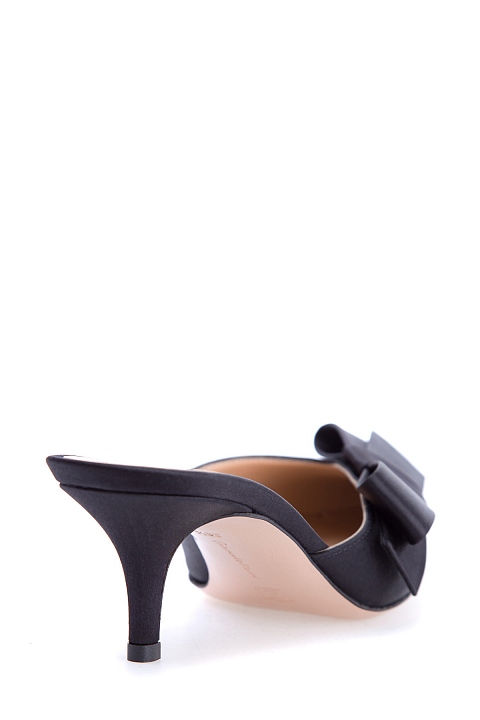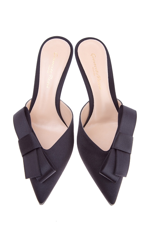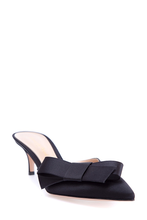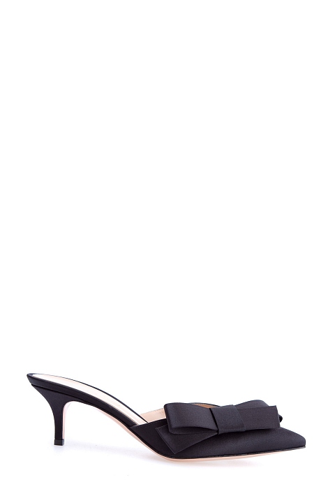 Изящные мюли из весенне-летней коллекции 2018 Gianvito Rossi выполнены из атласа черного тона с мягким блеском. Заостренный мысок декорирован лаконичным бантом. Элегантный каблук kitten hill высотой 5.5 см и кожаная стелька обеспечивают комфорт в течение всего дня. Сделано в Италии.