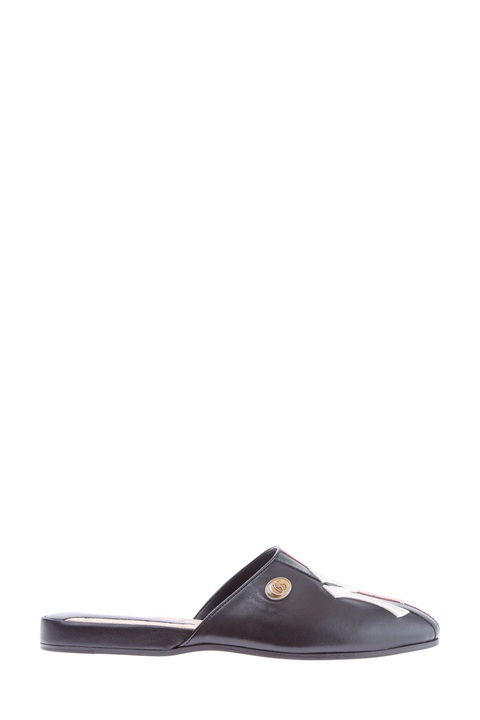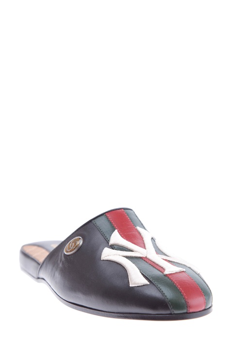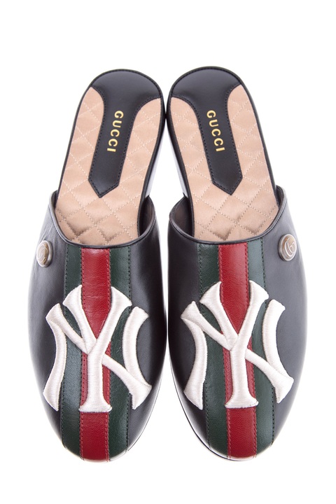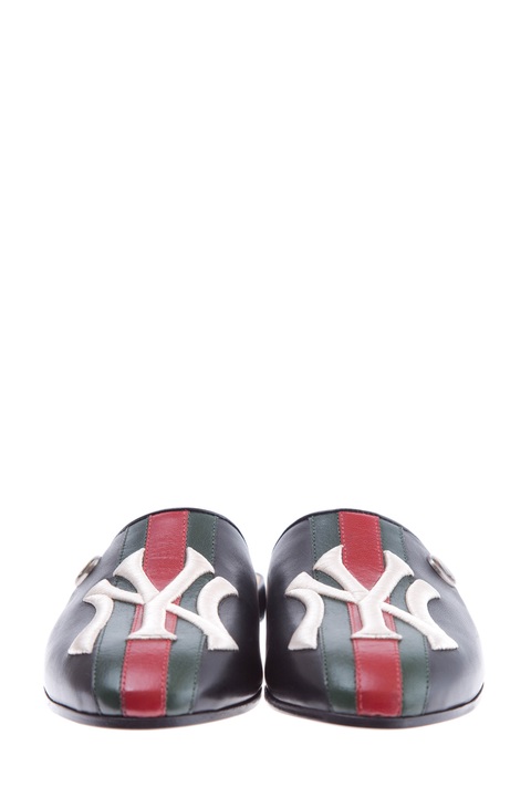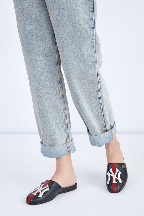 Стильные женские мюли от Gucci выполнены из полированной кожи черного цвета. Ленты в гамме Web декорированы объемной вышивкой с отсылкой к символике бейсбольной команды Высшей Лиги New York Yankees™. Модель с закругленным мыском и мягкой стеганной стелькой. Изделие закрыто плотной кожаной подошвой с прорезиненной вставкой. Сделано в Италии.