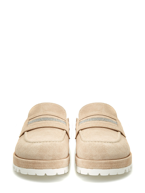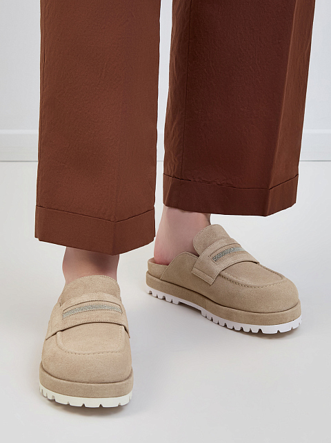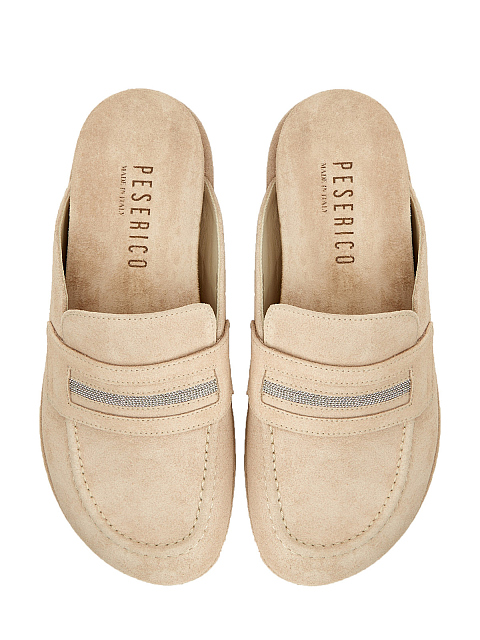 Стильные и комфортные мюли от Peserico созданы вручную из мягкой замши в актуальном нюдовом оттенке. Трендовая модель дополнена вышивкой рядами ювелирной цепочки Punto Luce, кожаной подкладкой и подошвой из вспененной резины с протектором. Сделано в Италии.