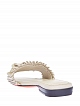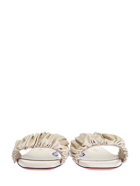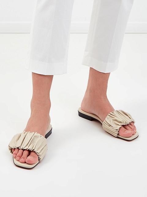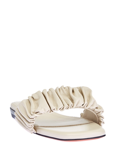 Лаконичные женские мюли от Santoni созданы вручную из мягкой телячьей кожи. Элегантный бежевый оттенок и минималистичный дизайн делает модель универсальным дополнением летних образов. Верхняя планка с драпированным эффектом подчеркивает расслабленный стиль изделия. Детали: скошенный мысок, невысокий наборный каблук. Сделано в Италии.