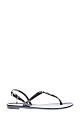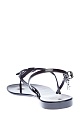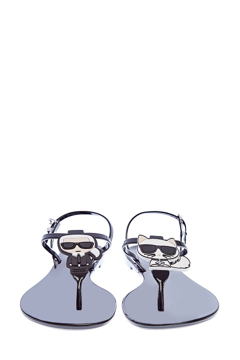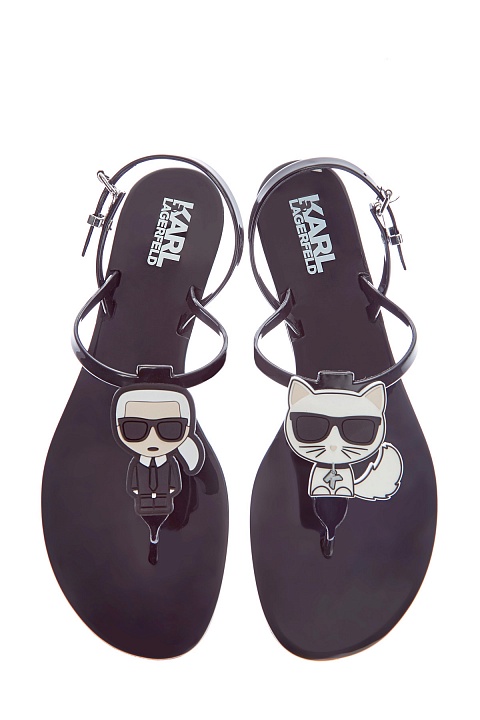 Лаконичные босоножки K/Ikonik от Karl Lagerfeld выполнены из гибкого силикона с глянцевой поверхностью черного цвета. Тонкие фиксирующие ремешки дополнены фирменным декором в виде мультипликационного воплощения модельера и его кошки Шупетт. Детали: ремешки в стиле вьетнамок, застежка на металлические пряжки.