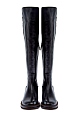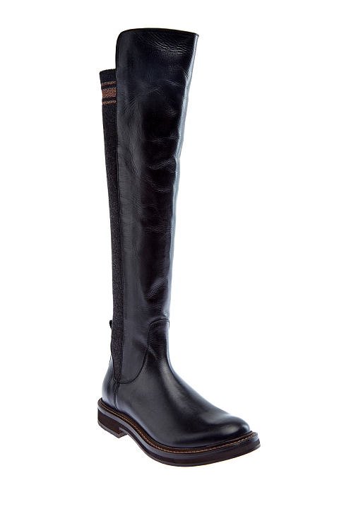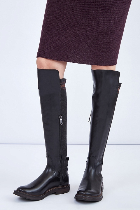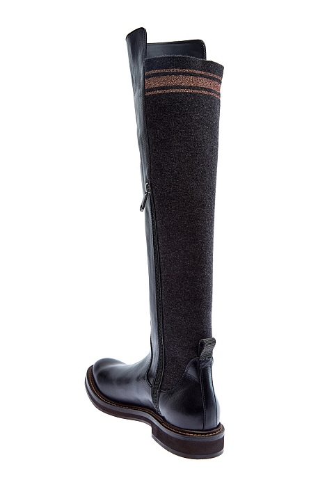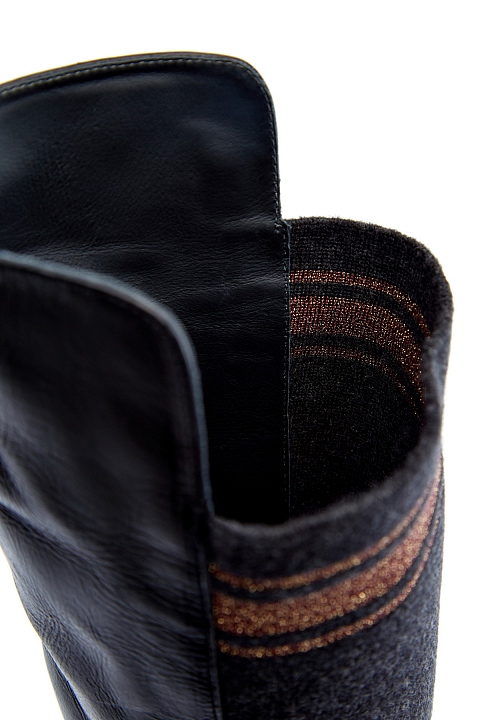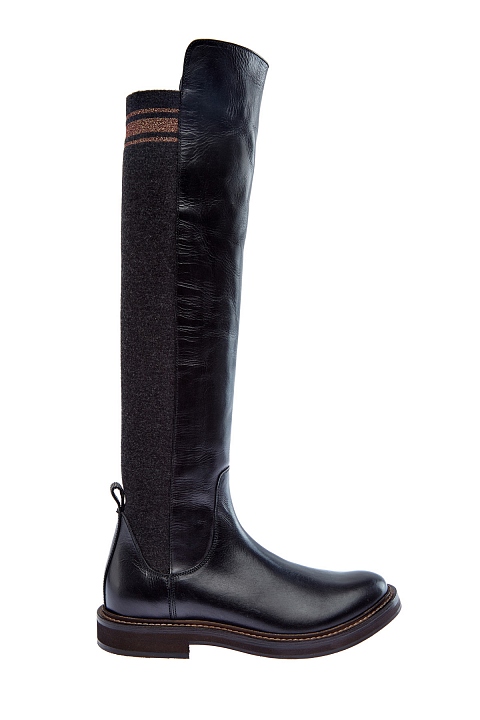 Женские сапоги из коллекции осень-зима Brunello Cucinelli в стиле жокейской формы. Модель характеризуется сочетанием плотной телячьей кожи черного цвета с эластичной вставкой из кашемирового трикотажа в рубчик, украшенной узором в полоску из сияющей нити ламе. Модель завершается подошвой из кожи и резины с декоративным рантом с контрастными строчками. Высота каблука 3,5 см. Сделано в Италии.