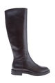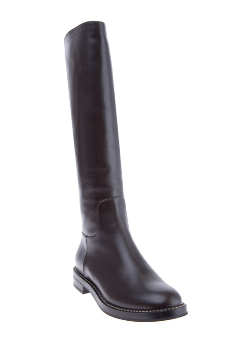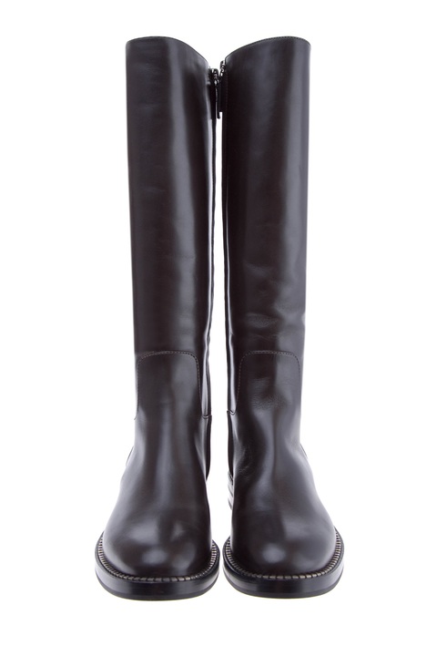 Классические женские сапоги из коллекции осень-зима Casadei из гибкой телячьей кожи коричневого цвета с матовым блеском на поверхности. Модель с меховым утеплением, округлым мыском и плотной подошвой с небольшим устойчивым каблуком украшена миниатюрными металлическими зубцами на ранте. Высота каблука 2,5 см, высота голенища 39 см. Сделано в Италии.