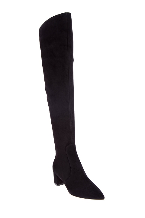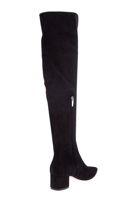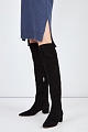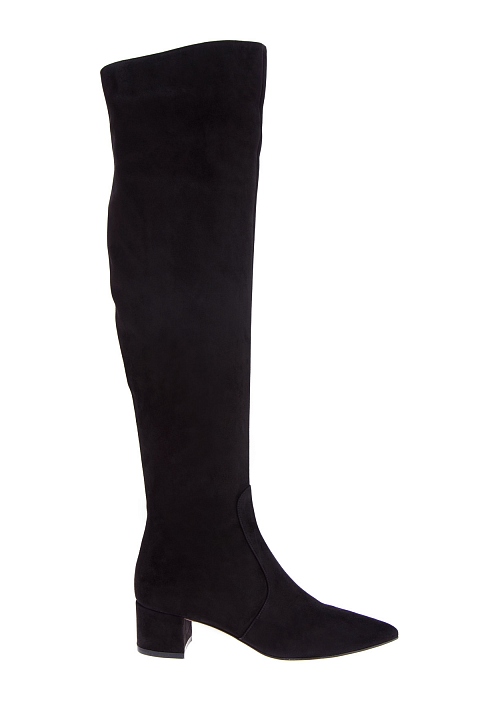 Классические сапоги-ботфорты "Rolling" из новой коллекции Gianvito Rossi с высоким голенищем, расширяющимся у кромки. Лаконичная модель с заостренным мыском без декоративных деталей, выполнена из мягкой замши с бархатистой поверхностью черного цвета. Устойчивый каблук высотой 4,5 сантиметра и небольшой разрез у кромки голенища обеспечивают комфорт во время носки. Фирменная символика в виде названия бренда расположена на подошве и пуллере молнии в боковом шве. Высота голенища 52 см. Сделано в Италии.