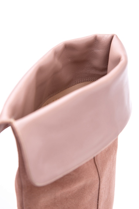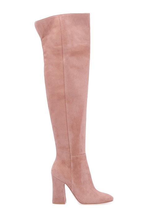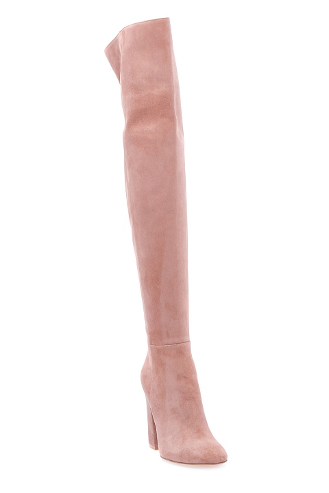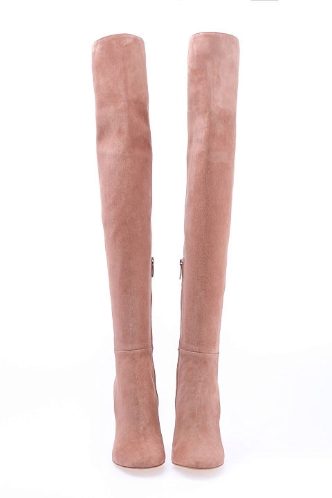Сапоги-ботфорты Gianvito Rossi с высоким голенищем, расширяющимся у кромки. Лаконичная модель без декоративных деталей выполнена из мягкой замши с бархатистой поверхностью нежно-розового цвета. Устойчивый каблук высотой 10 сантиметров обеспечивает комфорт во время носки. Фирменная символика в виде названия бренда расположена на подошве и на пулере молнии в боковом шве. Высота голенища 55 см. Сделано в Италии.