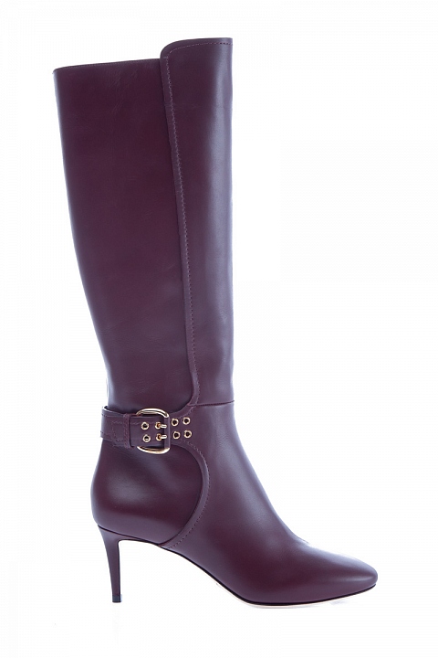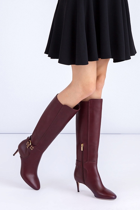 Яркие женские сапоги Darwin 65 от Jimmy Choo с асимметричным голенищем длиной по колено. Модель выполнена из гладкой кожи теленка, окрашенной в насыщенный бордовый цвет. Изделие характеризуется слегка зауженным мыском и декоративной пряжкой на щиколотке. Застежка осуществляется на замок-молнию в боковом шве. Высота каблука 6,5 сантиметров. Произведено в Италии.