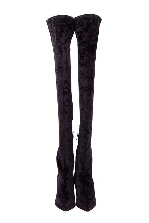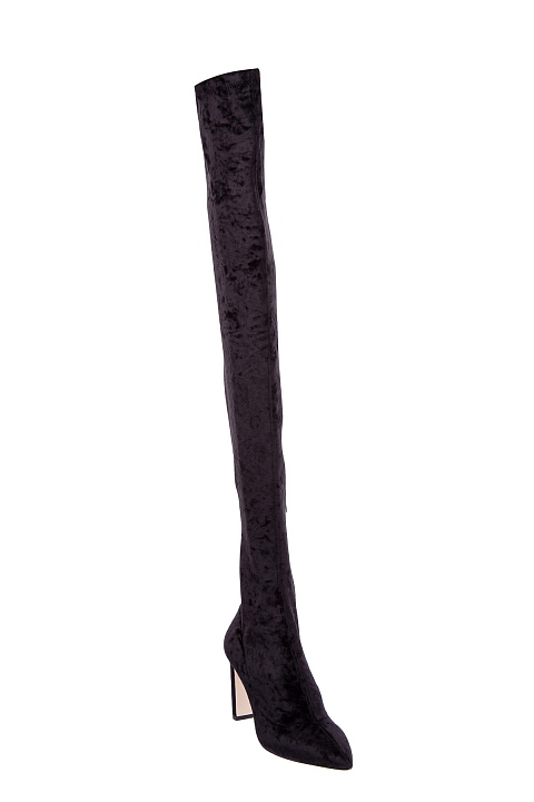 Эффектные ботфорты Lorraine из коллекции Jimmy Choo с заостренным мыском. Модель выполнена из стрейч-бархата черного цвета, обеспечивающего идеальную посадку и комфорт во время носки. Изделие закрыто кожаной подошвой с изящным каблуком высотой 8,5 см. Сделано в Италии.