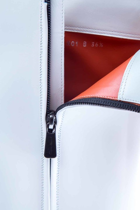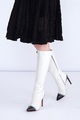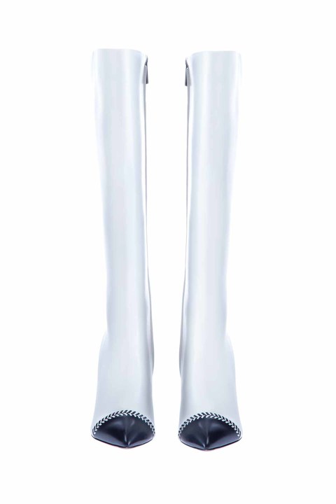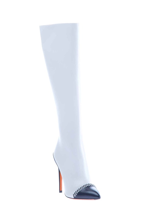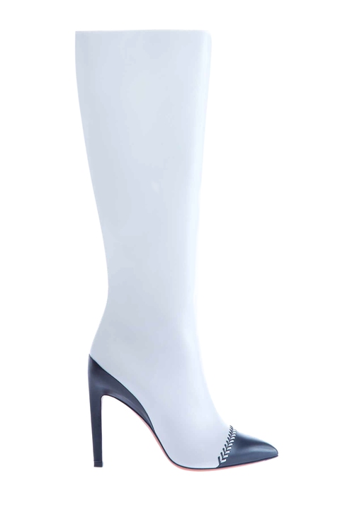 Женские сапоги из коллекции Rose Collection бренда Santoni, выполненные из гладкой телячьей кожи. Тонкий каблук шпилька обтянут контрастной кожей, переходящей на задник. Элемент перекликается по цвету с деталью, заимствованной из мужского гардероба, — визуально отрезанный мысок с объемным швом. Высота каблука 9 см, высота голенище 40 см. Произведено в Италии.
