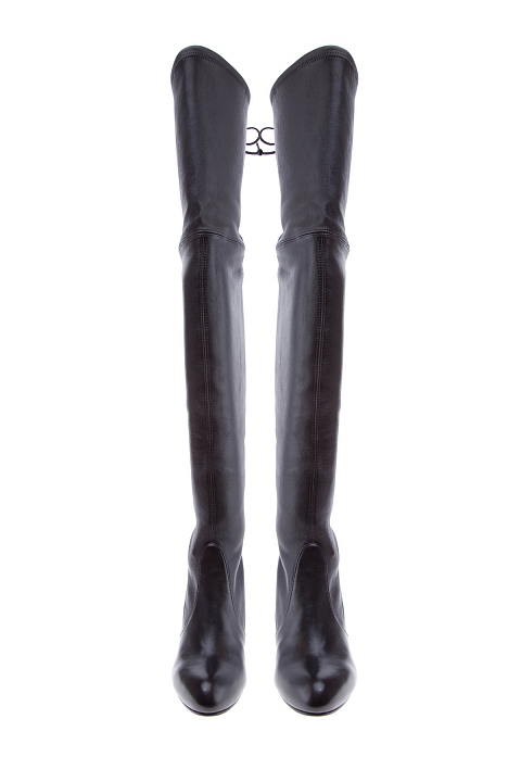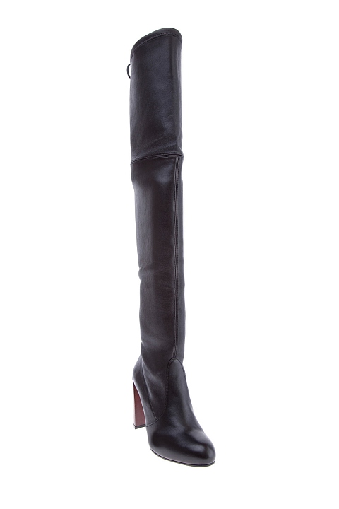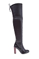 Стильные ботфорты от Stuart Weitzman созданы из глянцевой мелкозернистой кожи черного тона. Модель на устойчивом наборном каблуке высотой 10 см, созданным в оттенке красного дерева. Детали: элегантный заостренный мысок, голенище высотой 58 см, внутренняя текстильная отделка, кожаная стелька. Ширина верхней кромки регулируется при помощи шнура. Сделано в Испании.