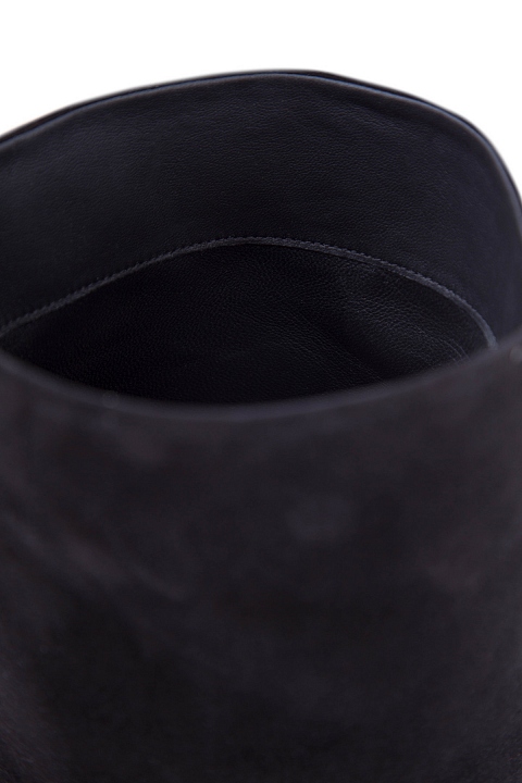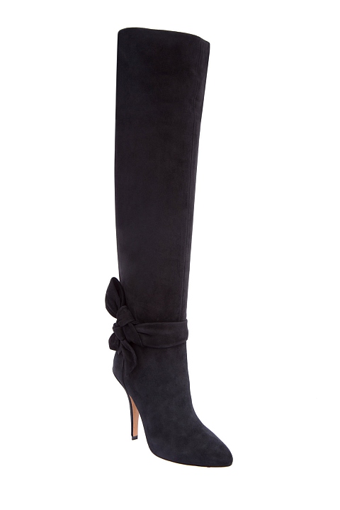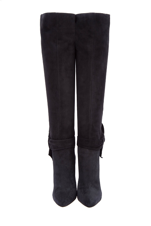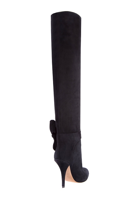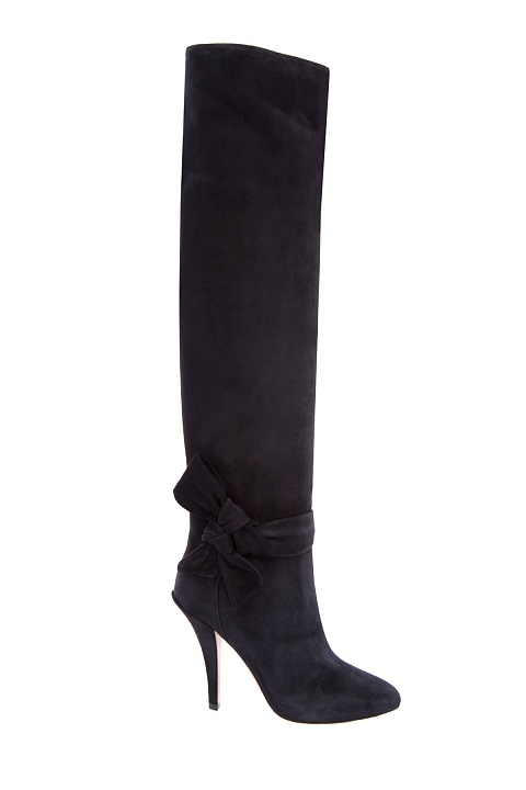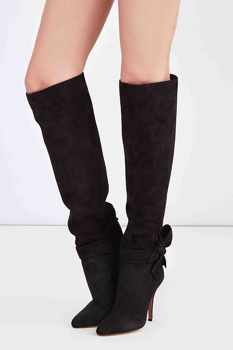 Элегантные ботфорты из коллекции осень-зима от Valentino Garavani выполнены из деликатной замши с бархатистой поверхностью черного тона. Обувь с изящным заостренным мыском и каблуком-шпилькой высотой 11 см. Фирменный шик модели придает расположенный на щиколотке декоративный элемент в виде банта с мягкими линиями. Высота широкого голенища составляет 50 см. Внутренняя отделка из кожи и дышащая стелька обеспечивают комфорт в течение дня. Сделано в Италии.