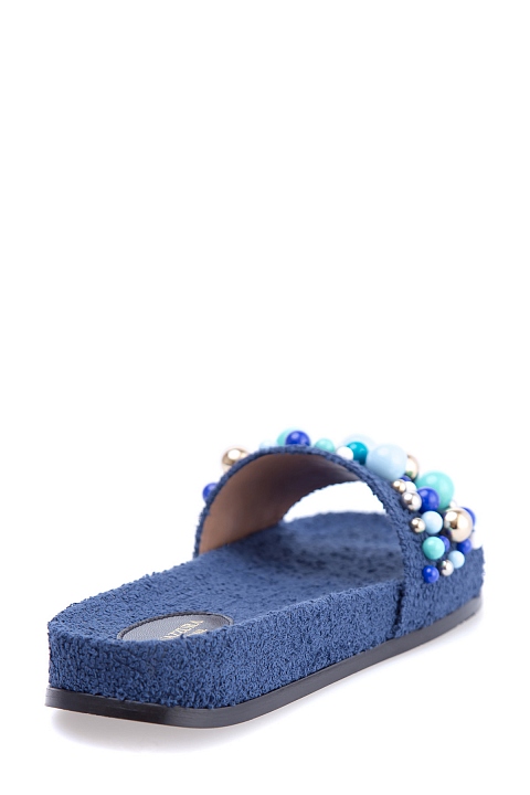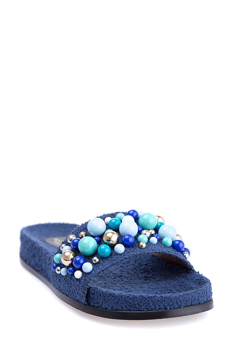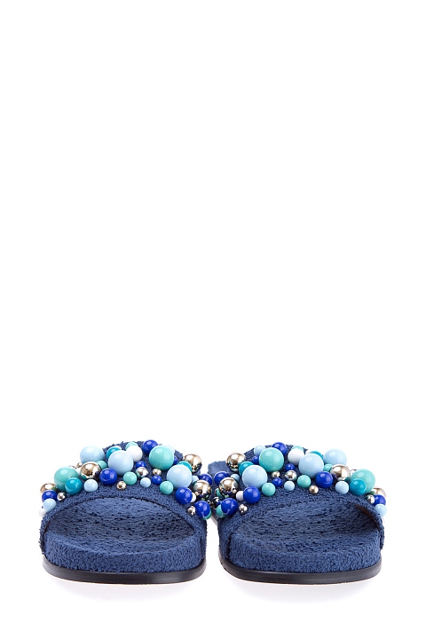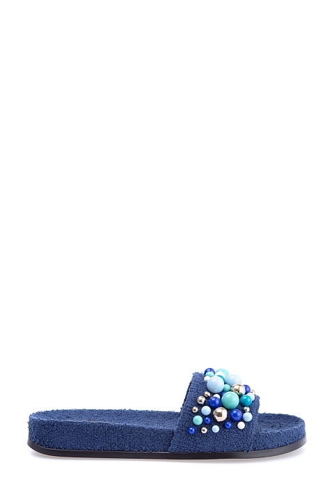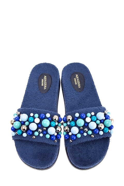 Женские сланцы Bon Bon от Aquazzura, сочетающие комфорт и изысканные детали. Модель из губчатого шероховатого текстиля чернильно-синего цвета имеет глубокую, удобную стельку с символикой бренда и объемное украшение в виде россыпи бусин разных размеров. Сделано в Италии.