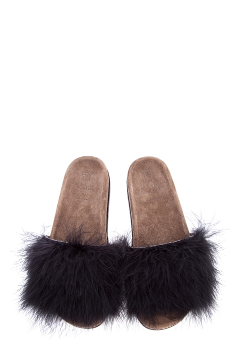 Эффектные шлепанцы Feathers & Shine из коллекции Brunello Cucinelli с удобной анатомической подошвой выстланной мягкой бархатистой замшей коричневого тона с отделкой ранта репсовой лентой с бусинами «монили». Модель украшена мягким пухом марабу, закрепленным на специальной нити, пришитой к поверхности, что создает невесомый пышный эффект. Сделано в Италии.