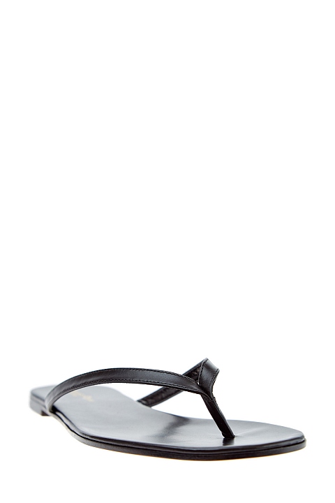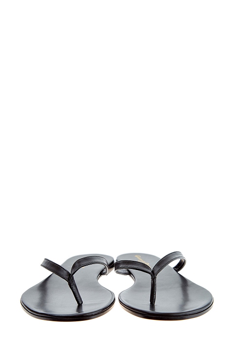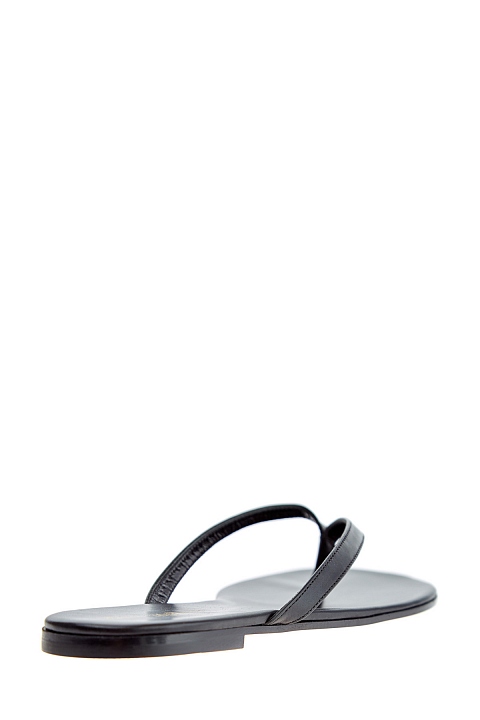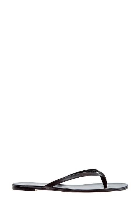 Минималистичные шлепанцы-вьетнамки от Gianvito Rossi полностью выполнены из кожи с матовой мелкозернистой поверхностью черного цвета. Благородный материал делает модель идеальной для составления повседневных летних образов. Тонкие ленты придают обуви изящества. Детали: гибкая кожаная подошва, дышащая стелька. Сделано в Италии.