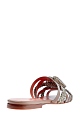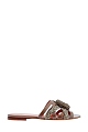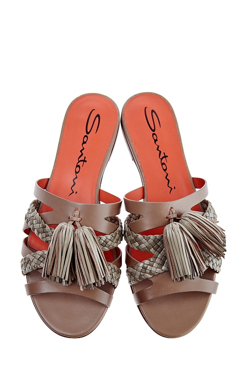 Эффектные шлепанцы от Santoni созданы из мягкой кожи с матовой поверхностью холодного бежевого оттенка. Верхняя панель изделия из двух фигурных элементов образует сложный геометрический узор, который дополнен объемной плетеной деталью с кисточками в стиле этно. Детали: внутренняя отделка из кожи, невысокий каблук. Сделано в Италии.
