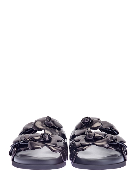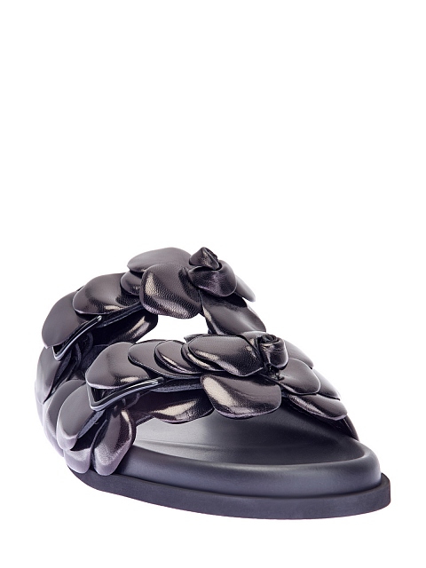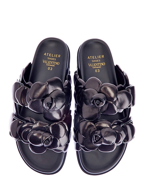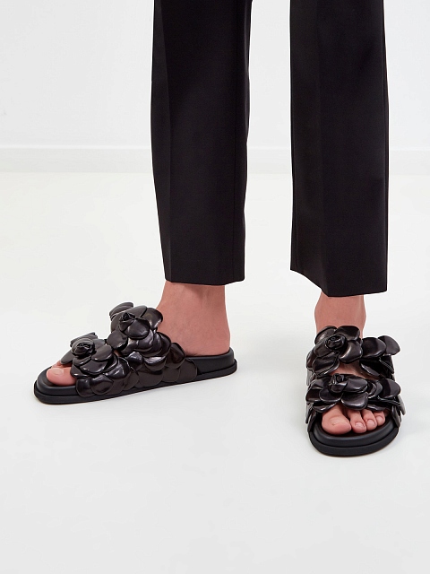 Эффектные шлепанцы Atelier Shoes 03 Rose Edition от Valentino Garavani выполнены в черном цвете из полуглянцевой гладкой кожи. Анатомическая стелька Fussbett обеспечивает максимальный комфорт в летний сезон, объемная отделка ручной работы подчеркивает присущую бренду изысканность. Сделано в Италии.
