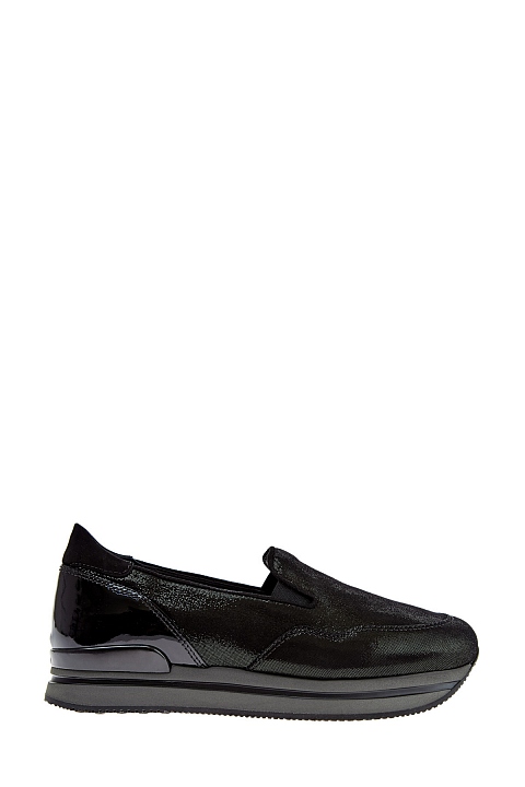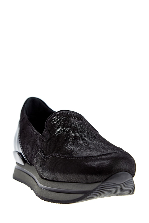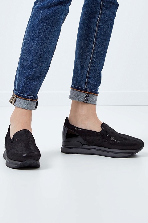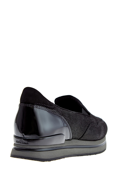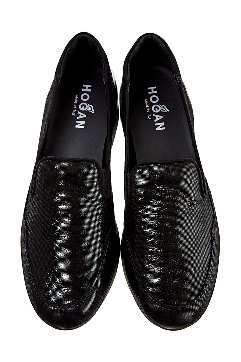 Базовые женские слипоны от Hogan выполнены из дышащего текстиля с мерцающей поверхностью в черном цвете. Контраст фактур в образ вносят вставки из глянцевой кожи и замши в тон, лаконичный дизайн дополняет плотная трехслойная подошва из вспененного каучука толщиной 3 см. Эластичные вставки позволяют комфортно снимать и надевать модель.
