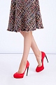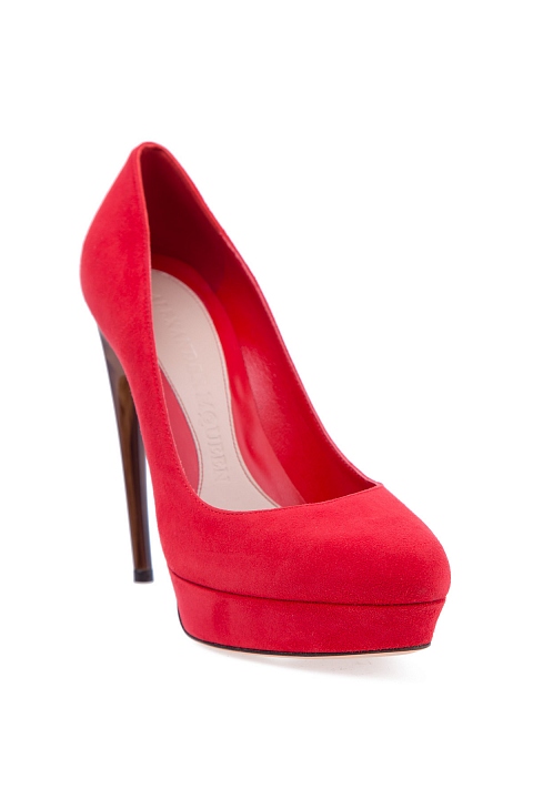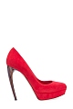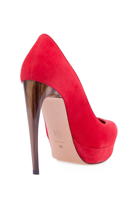 Эффектные туфли Horn из коллекции Alexander McQueen. Модель выполнена из гибкой замши сочного красного цвета и дополнена фигурной шпилькой из рога, с нанесённым вручную покрытием. Изделие с комфортной кожаной стелькой и подошвой с символикой бренда. Высота платформы под мыском 2 см, высота каблука 12,5 см. Сделано в Италии.