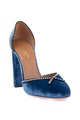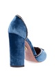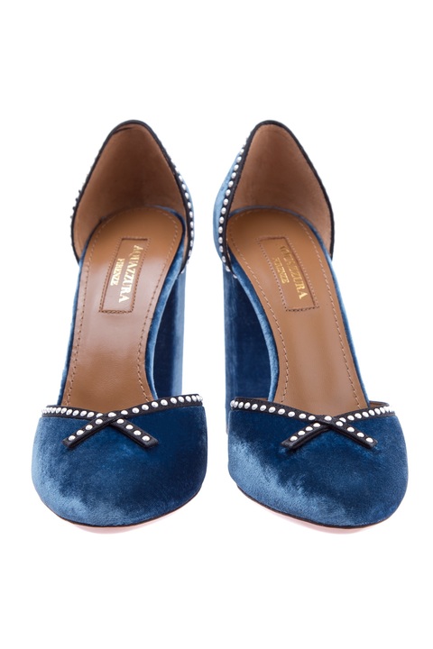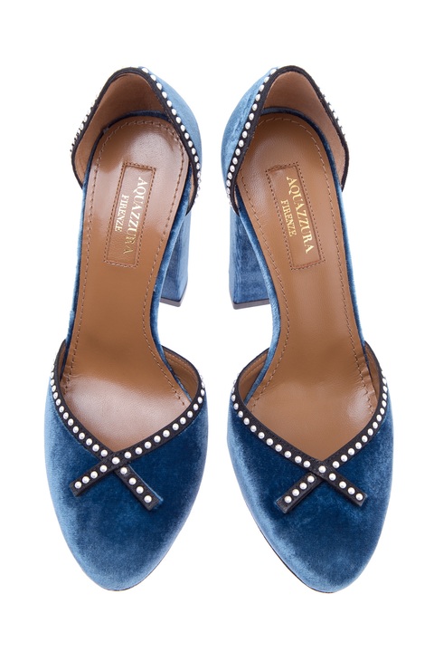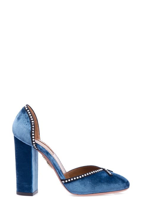 Эффектные туфли Lou Lou Pump 105 Aquazzura, выполненные из кожи, обтянутой бархатом цвета океана. Закрытый круглый мысок и задник украшены текстильной лентой с бусинами-кабошонами. Кожаная подошва с символикой бренда в виде ананаса дополнена устойчивым каблуком высотой 10,5 см. Сделано в Италии.