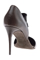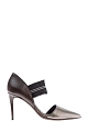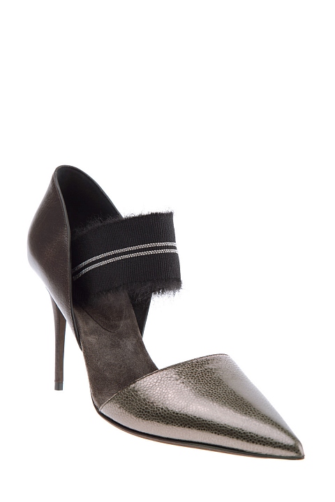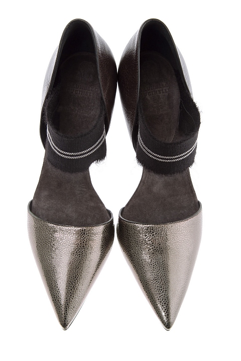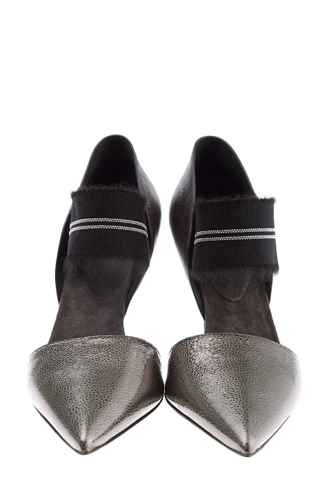 Туфли из осенне-зимней коллекции Brunello Cucinelli с изящным заостренным мыском, из кожи Broken Glass с металлическим блеском на неоднородной галечной поверхности. Модель характеризуется сочетанием с кожей в шоколадном оттенке Minimal на закрытой пятке и каблуке и лентой грогрен из мохера с вышитым узором в полоску блестящей цепочкой Монили. Мягкая внутренняя отделка и стелька из замши завершают изделие. Высота каблука 8,5 сантиметров. Сделано в Италии.