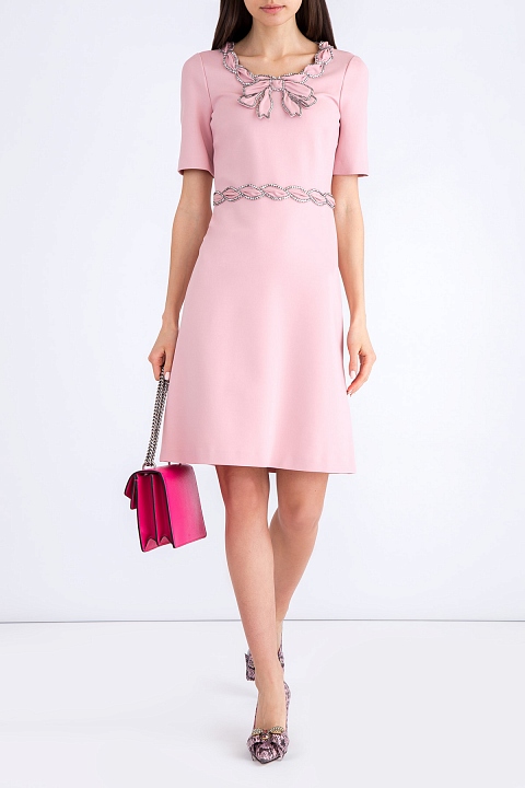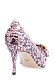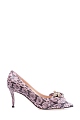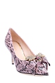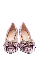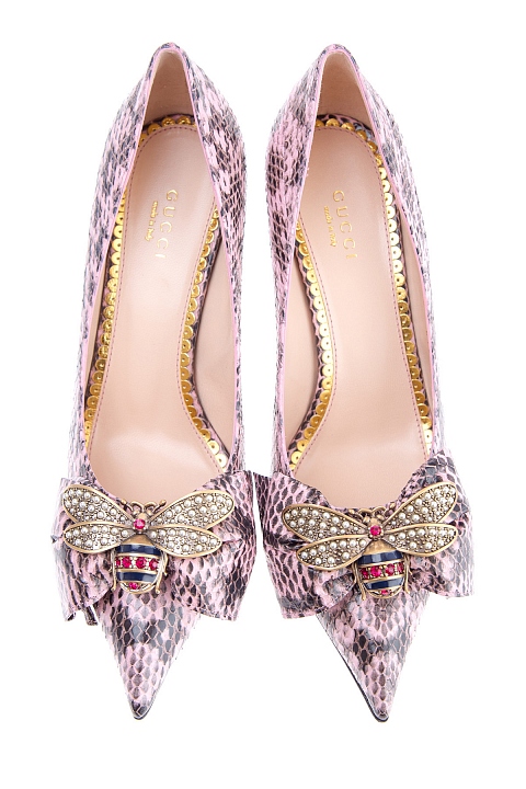 Эффектные туфли Gucci, созданные из гибкой кожи питона с характерными чешуйками и орнаментом на поверхности розового оттенка. Модель характеризуется тонкой подошвой с аккуратным каблуком-рюмочкой и украшением в виде банта и крупной броши-пчелы, ставшей знаковым символом бренда. Высота каблука 7,5 см. Сделано в Италии.