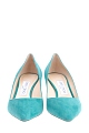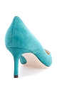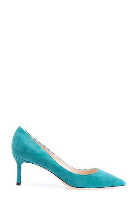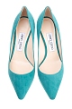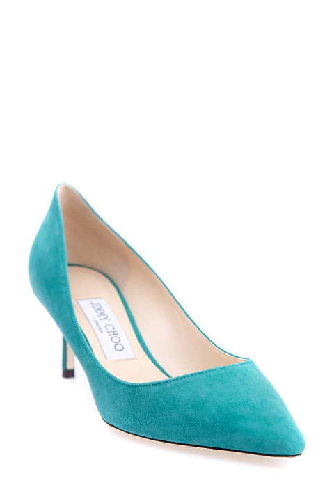 Элегантные туфли-лодочки Romy от Jimmy Choo. Модель с заостренным мыском выполнена из гибкой замши с бархатистой поверхностью бирюзового цвета. Внутренняя отделка и стелька представлены в контрастном бежевом оттенке. Изделие завершается противоскользящим рисунком протектора и небольшим каблуком-рюмочкой высотой 6 см. Сделано в Италии.