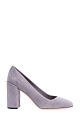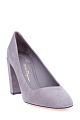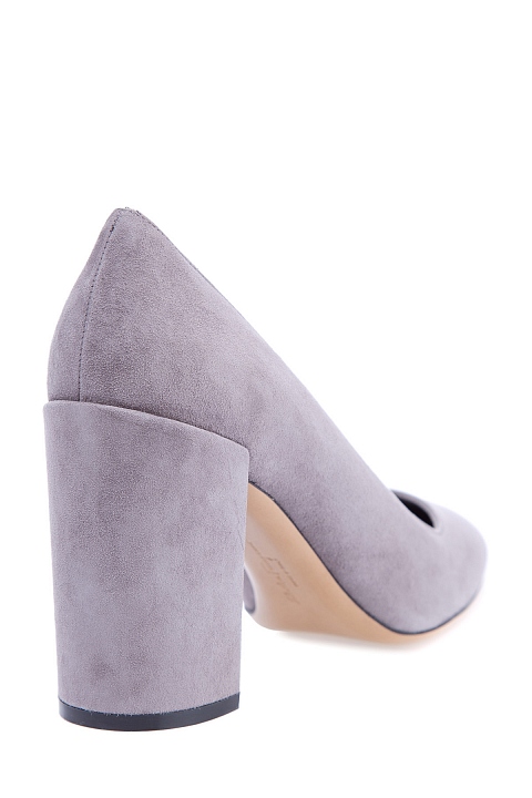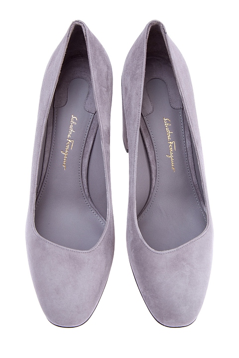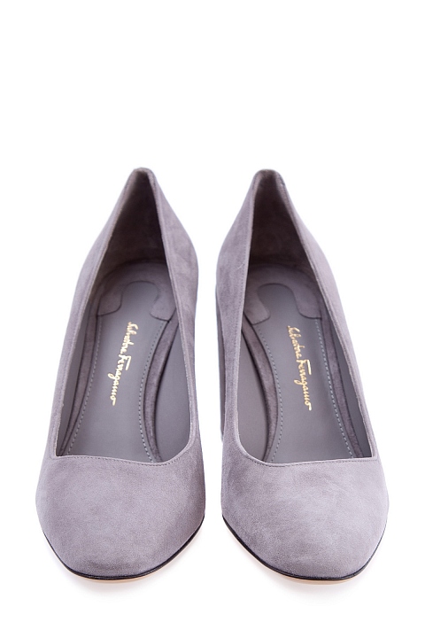Лаконичные женские туфли Salvatore Ferragamo со скошенным мыском. Модель выполнена из замши с бархатистой поверхностью серого цвета и дополнена кожаной стелькой и подошвой с символикой бренда. Изделие на массивном устойчивом каблуке высотой 9 см. Сделано в Италии.